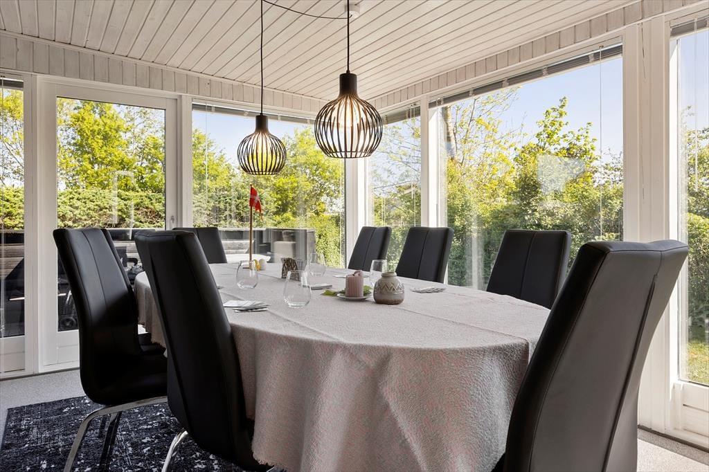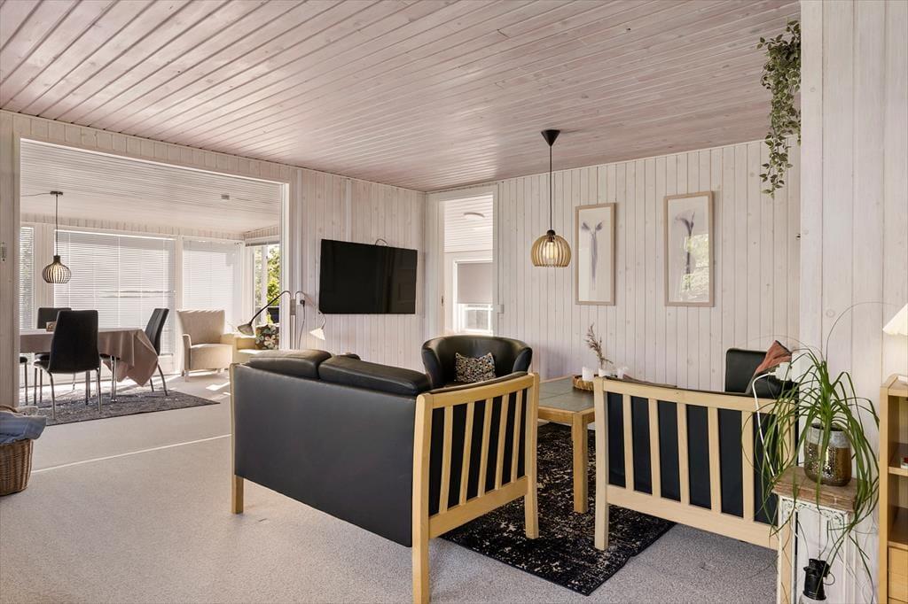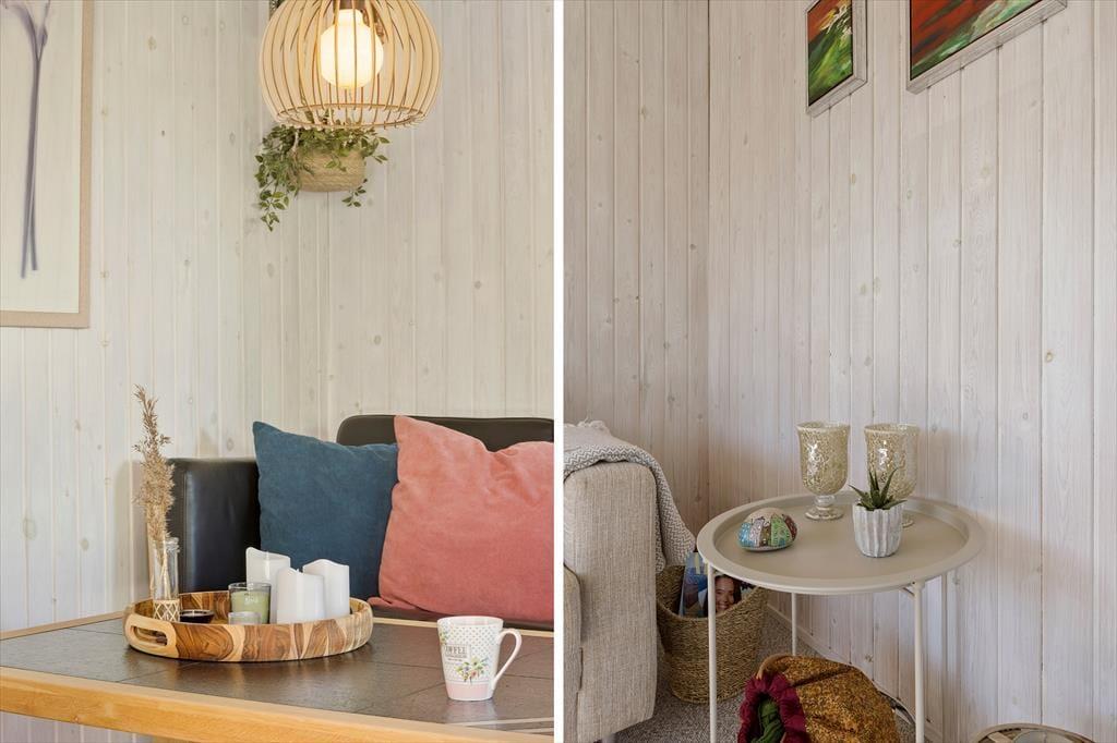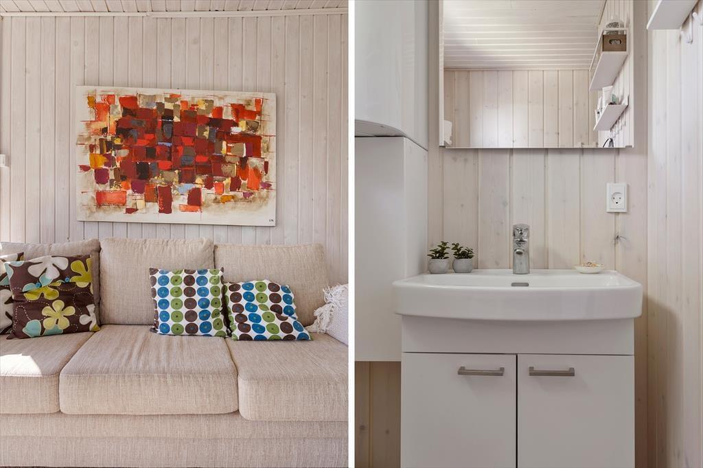 Når du træder ind i sommerhuset, bliver du mødt af en lys og imødekommende atmosfære. Den dejlige havestue er husets hjerte – her kan du sidde med en kop kaffe og nyde udsigten til den store have, mens solens stråler strømmer ind gennem de store vinduespartier. Huset er indrettet med et køkken for sig og en stue, hvor I kan samles om måltiderne, og huset byder på en varmepumpe, der skaber varme på kølige aftener. Efter en lang dag i det fri kan du forkæle dig selv med lidt ekstra velvære i husets sauna, som gør ferien endnu mere afslappende.