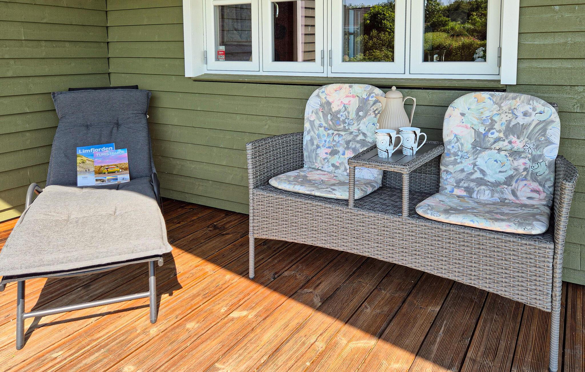 Fra stuen har I udgang til den delvist overdækkede terrasse, hvor I kan sole jer, mens I nyder udsigten over fjorden. I har også en grill til rådighed, så I kan afslutte en eller flere aktive feriedage med en dejlig grillaften. Der er god plads til, at børnene kan løbe rundt og lege på grunden.