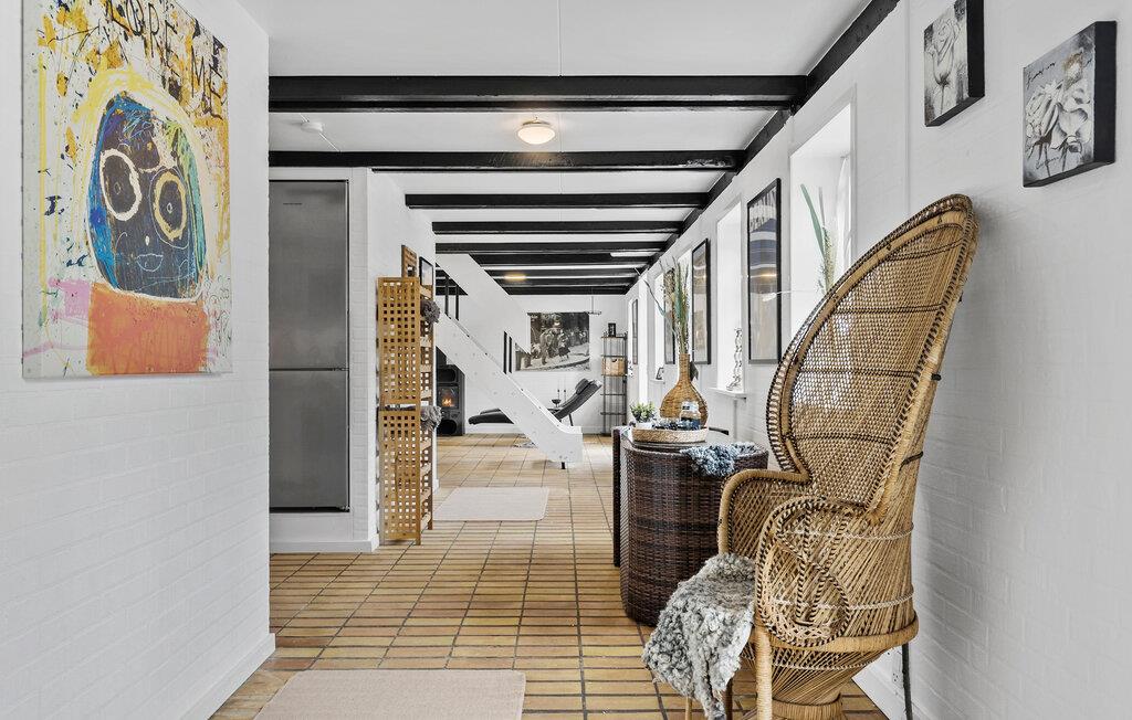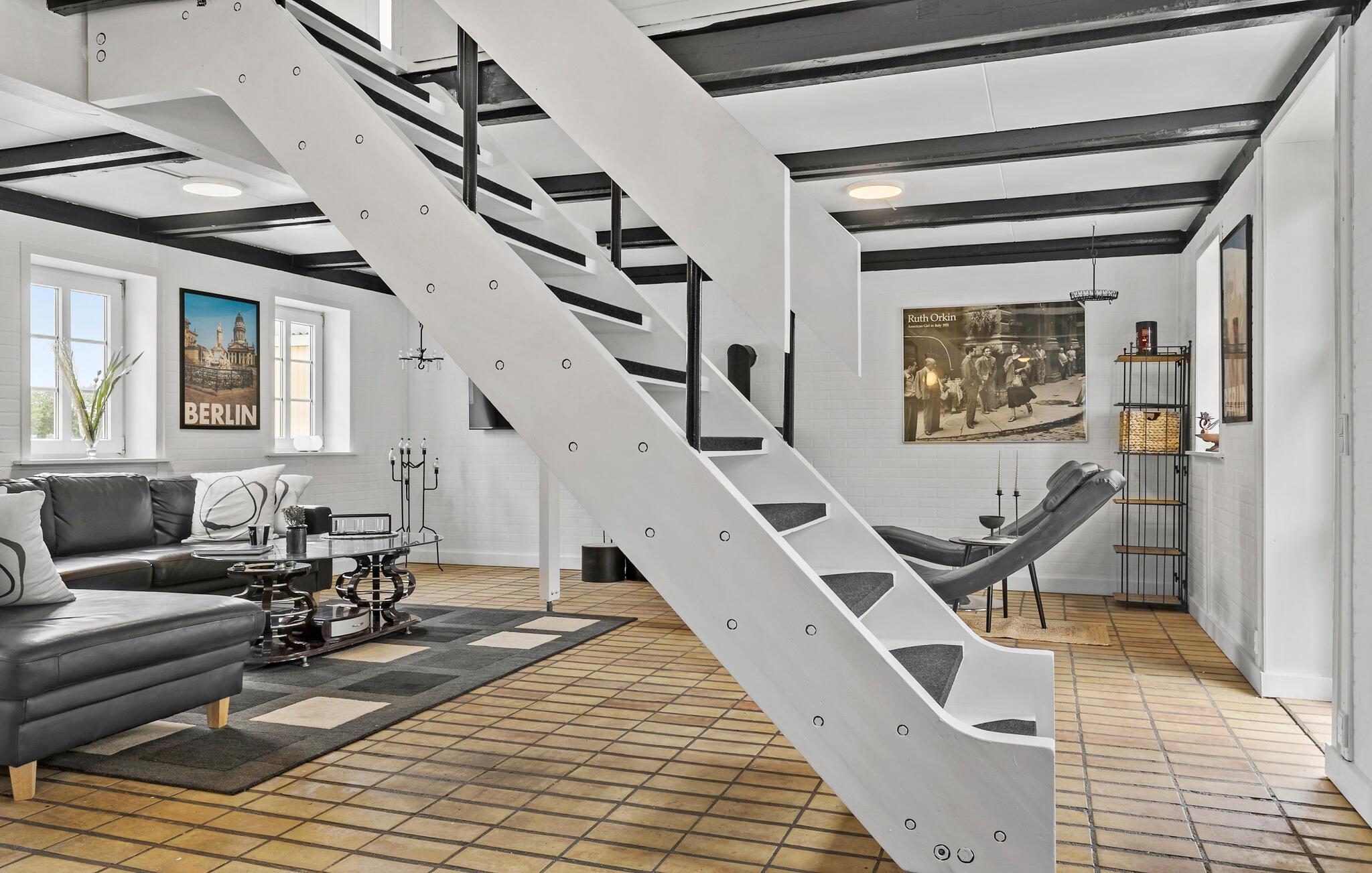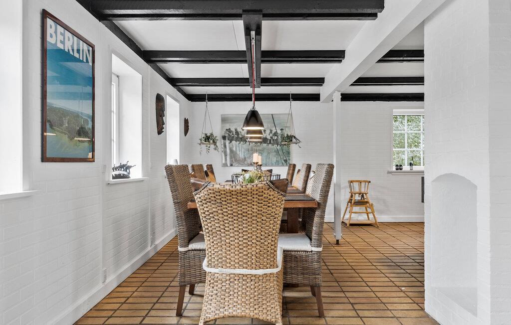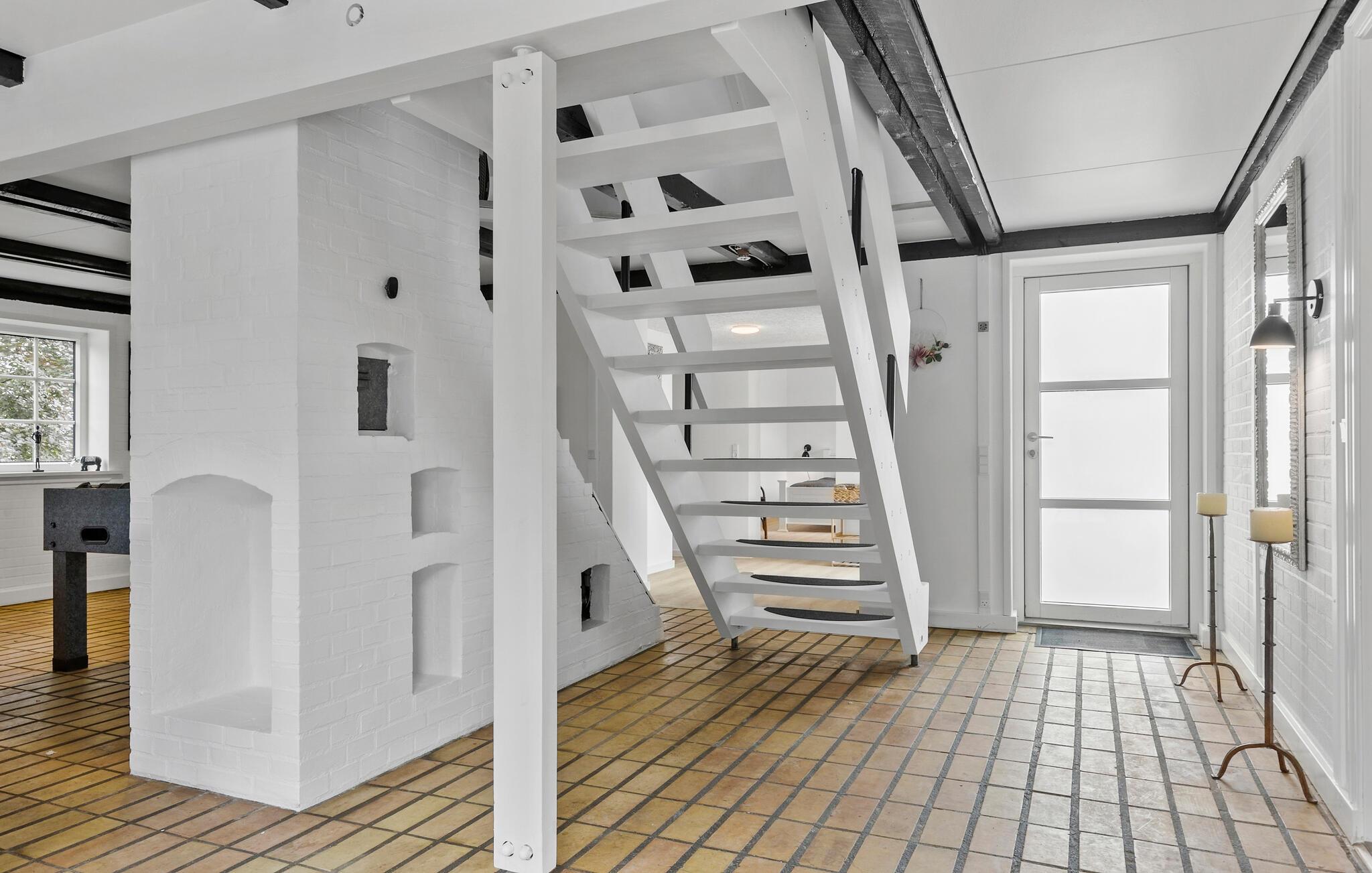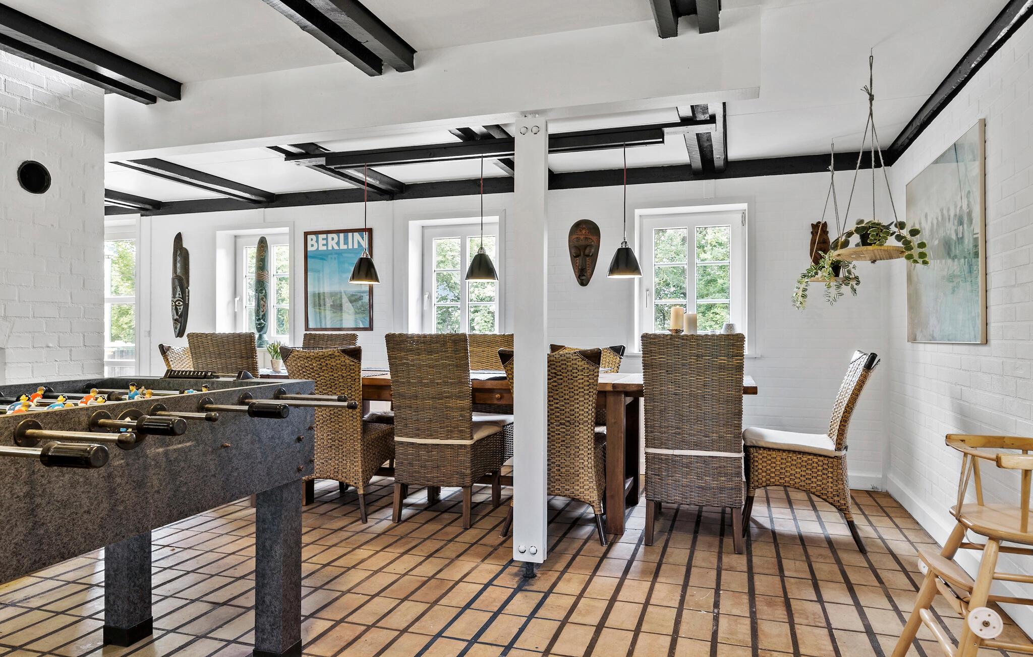Glæd jer til jeres ferie sammen med hele familien eller en gruppe af venner i dette komfortable og store feriehus, som byder på en lys atmosfære, charmerende loftsbjælker og en tiltalende indretning. Her finder I noget for enhver smag. Læg jer for eksempel i liggestolene i stuen, og nyd den dejlige varme fra brændeovnen. I kan også spille bordfodbold eller nyde udsigten fra første sal ud over haven.