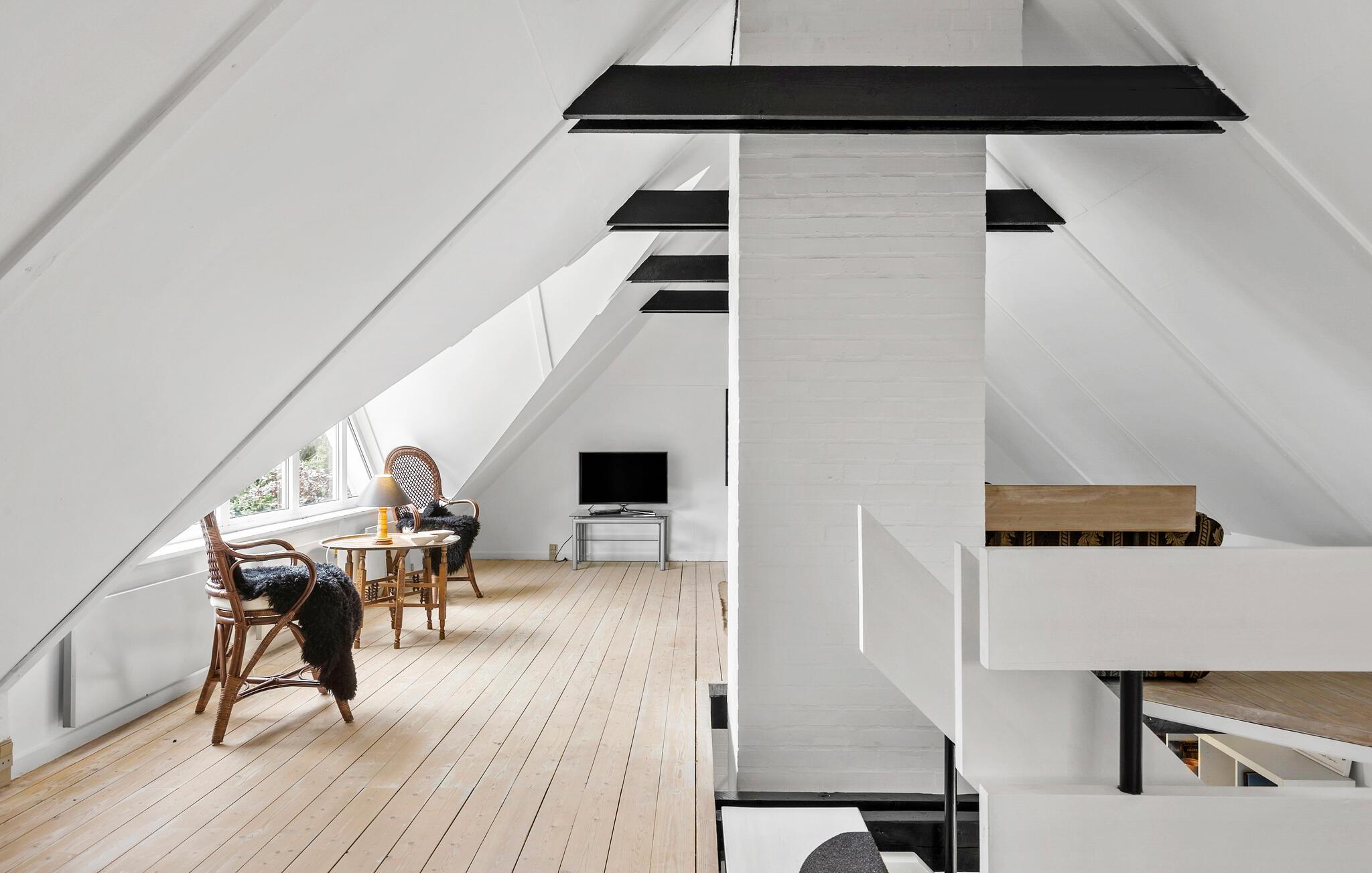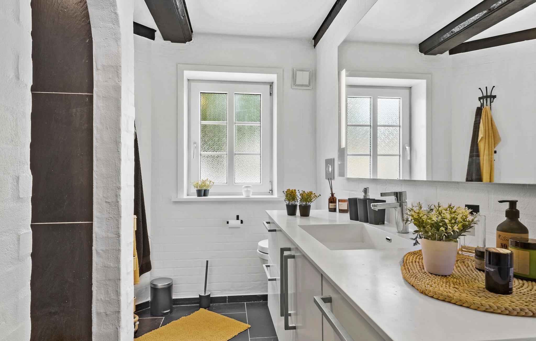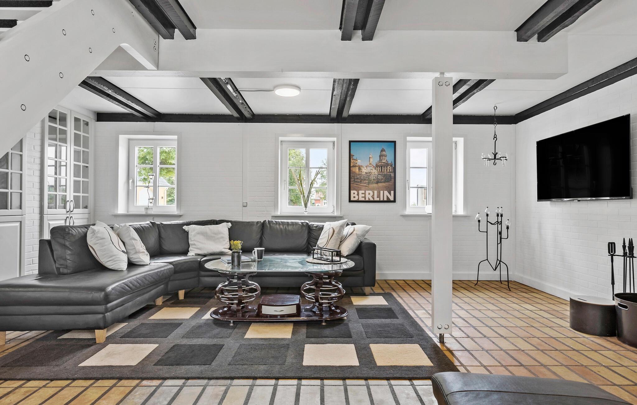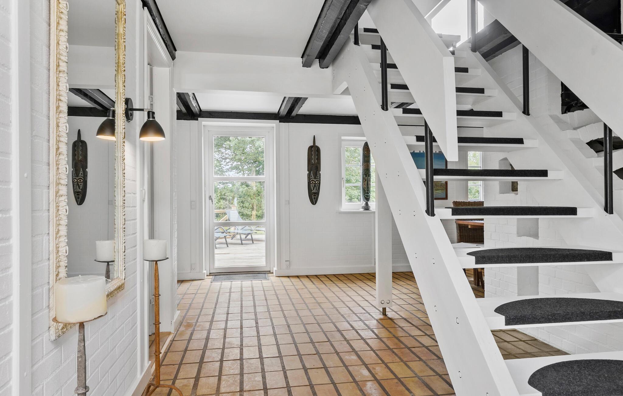 Glæd jer til jeres ferie sammen med hele familien eller en gruppe af venner i dette komfortable og store feriehus, som byder på en lys atmosfære, charmerende loftsbjælker og en tiltalende indretning. Her finder I noget for enhver smag. Læg jer for eksempel i liggestolene i stuen, og nyd den dejlige varme fra brændeovnen. I kan også spille bordfodbold eller nyde udsigten fra første sal ud over haven.