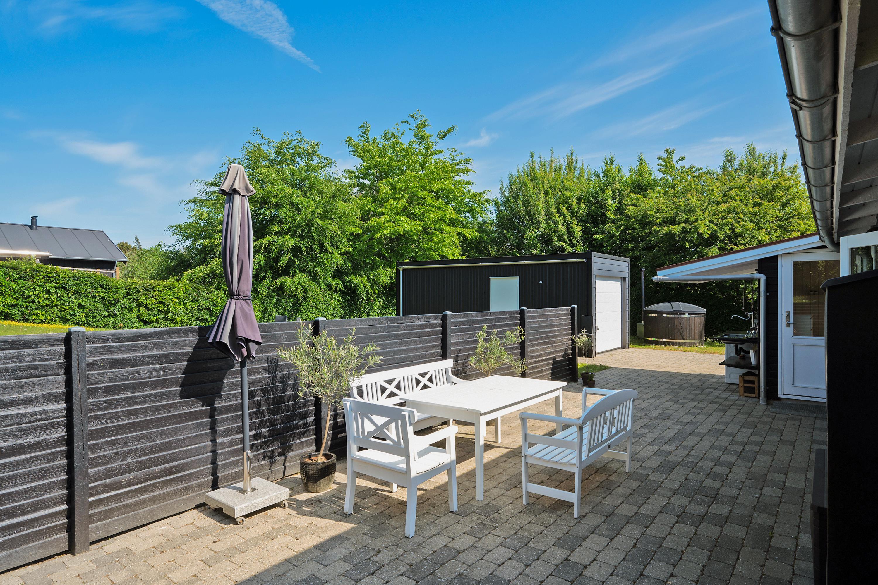 Hyggeligt og renoveret feriehus nær Holme Strand med overdækket terrasse og naturgrund.
