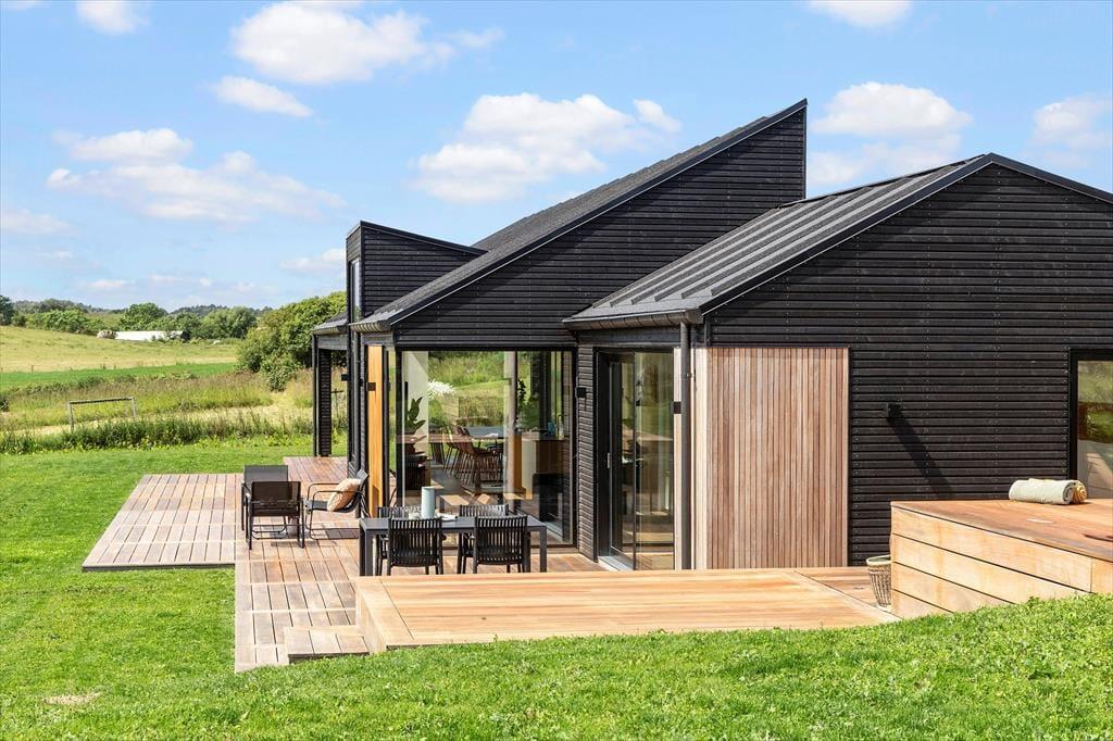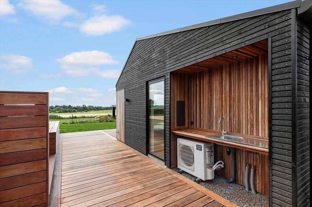 Fra spiseområdet kan du træde direkte ud på den store, overdækkede terrasse, hvor du kan nyde en rolig morgen med en kop kaffe eller samle familien til en hyggelig grillaften. Haven er ideel til både leg og afslapning – måske en fodboldkamp med børnene, mens du tænder op i grillen? På husets bagside finder du et skønt terrasseområde i flere niveauer, hvor du kan solbade, nyde din yndlingsmusik eller tage en forfriskende dukkert i den udendørs badekar. Fyld det med koldt vand og prøv et opkvikkende isbad – en skøn måde at starte dagen på!