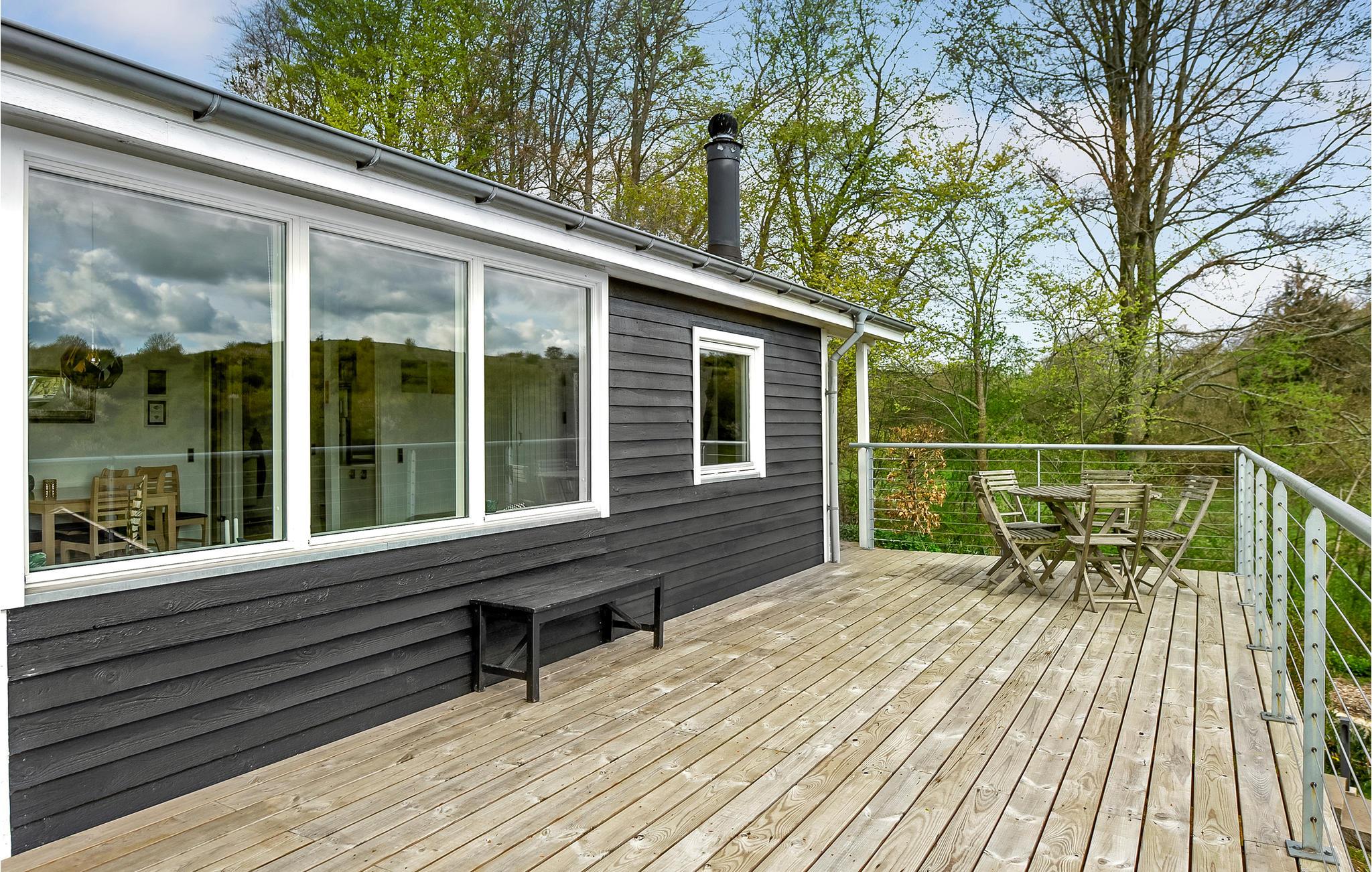 Den store terrasse har smuk udsigt over landskabet. Her kan I slappe af med en lækker middag, nyde solen eller tage en dukkert i vildmarksbadet. For ekstra komfort er terrassen udstyret med liggestole, havemøbler og grill.