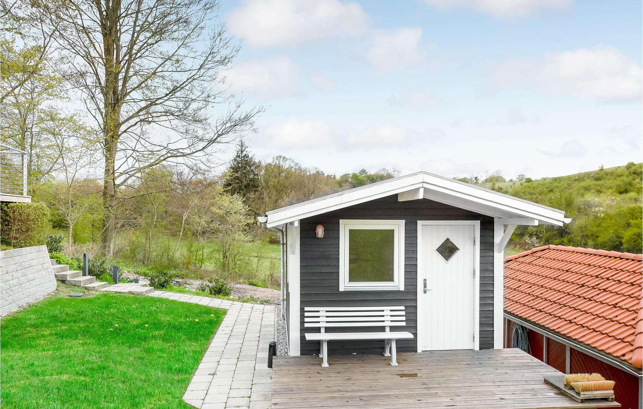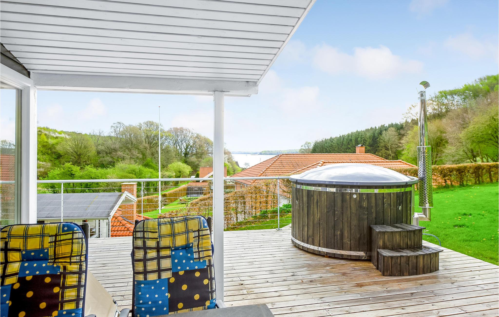 Charmerende sommerhus nær Kolding Fjord med stor terrasse, vildmarksbad og tæt på strand og byliv.