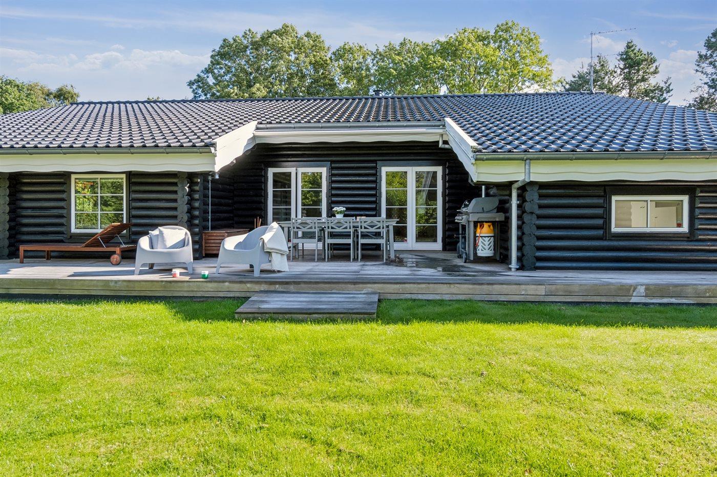 Dejligt bjælkesommerhus med stor have og terrasse nær familievenlig strand i Dronningmølle.