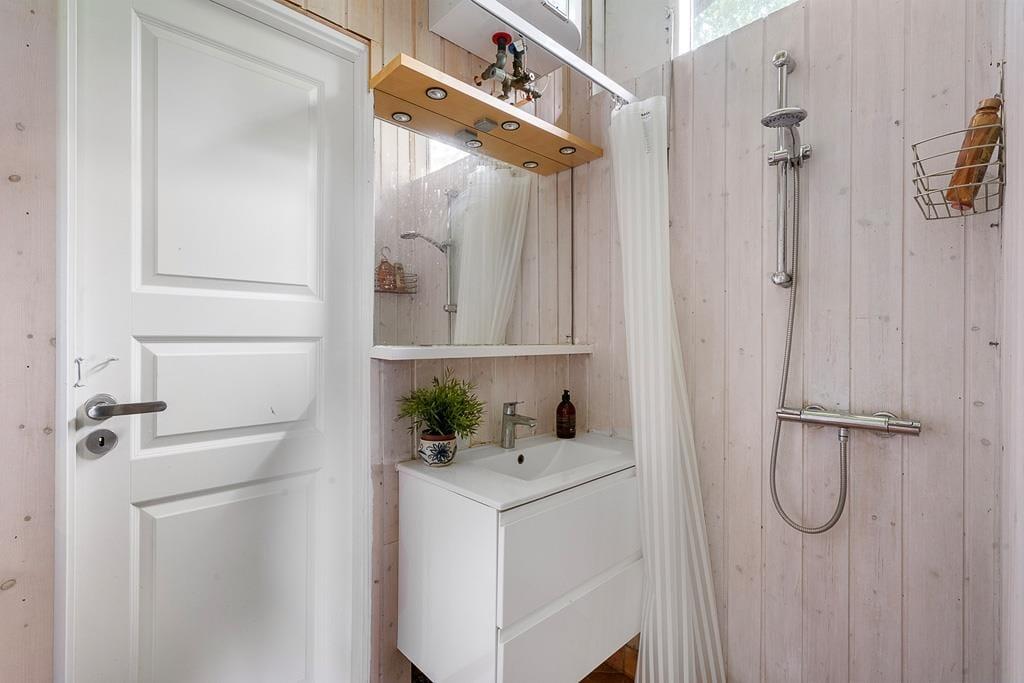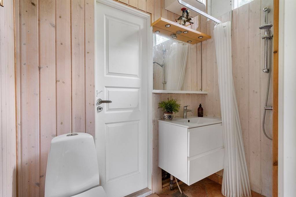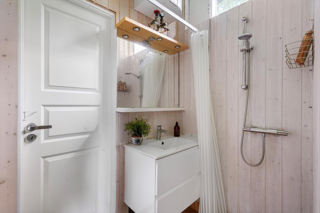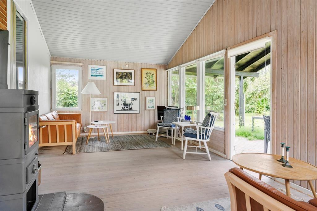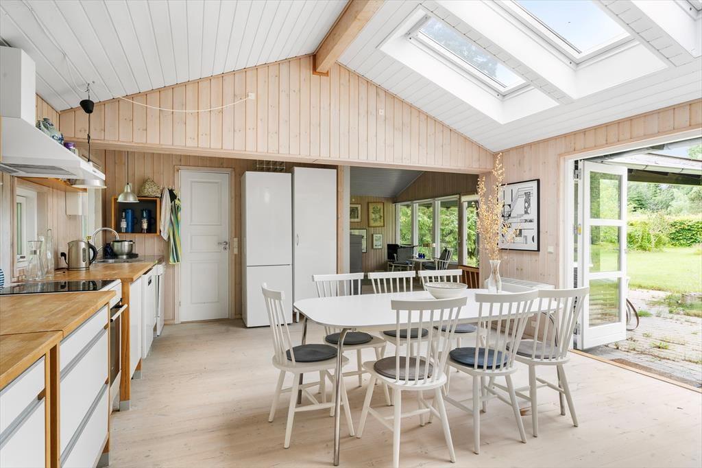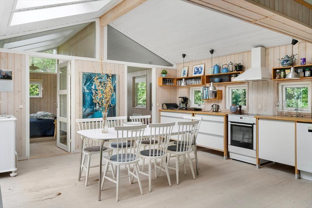 Den dejlige opholdsstue er designet til at skabe hyggelige formiddage med brætspil og hjemmebag, samt afslappende aftener med yndlingsfilmen på TV'et. Store vinduer lukker masser af naturligt lys ind og giver en fantastisk udsigt til den smukke have. Her er rammen sat for kvalitetstid med familie og venner. Køkkenet er udstyret med alt, hvad du har brug for til madlavning både morgen, middag og aften. Fra køkkenet er der direkte udgang til terrassen, hvor du kan nyde dine måltider udendørs i den friske luft. Sommerhuset tilbyder behagelige sovepladser fordelt på tre soveværelser med dobbeltsenge. Det ene soveværelse har også direkte adgang til badeværelset, hvilket giver ekstra komfort og bekvemmelighed.