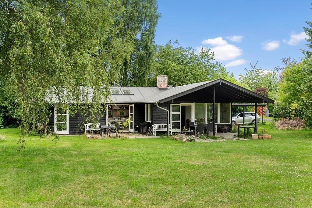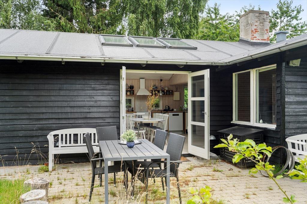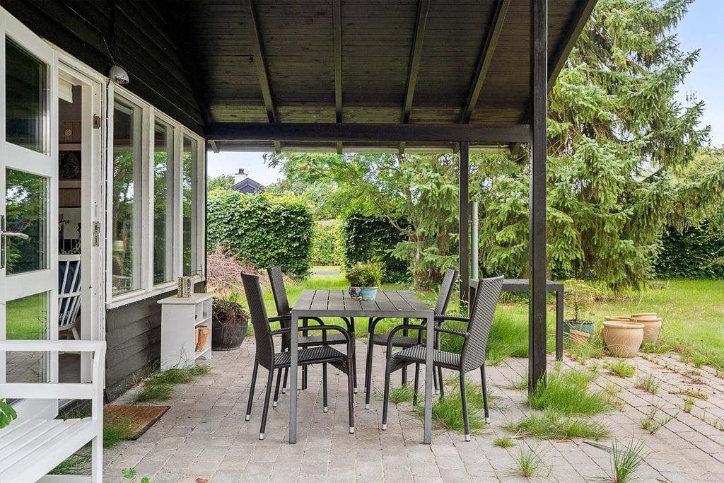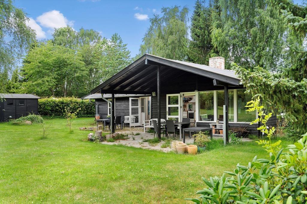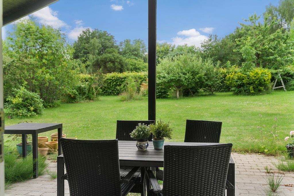 Udendørs er haven omkranset af træer og buske, hvilket skaber en privat og fredfyldt atmosfære. Den store græsplæne giver masser af plads til leg og spil for både børn og voksne. Under den overdækkede terrasse kan du sidde til sent ud på aftenen, selv efter duggen er faldet, og nyde den totale stilhed.