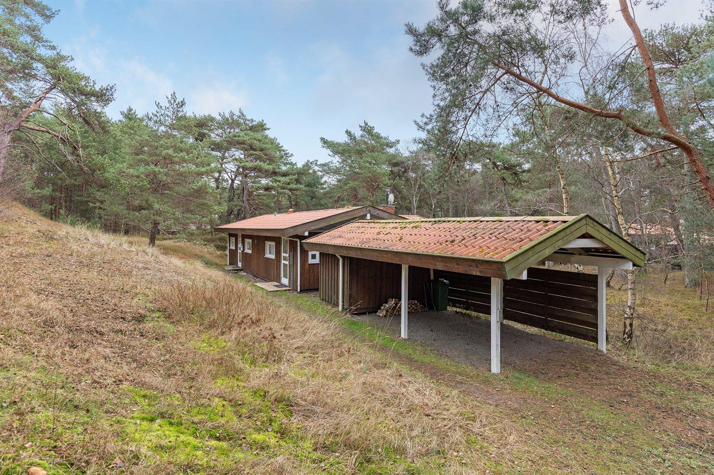 Ferieboligen er beliggende på en 2500 m² stor naturgrund. Der er 1000 m til havet. Nærmeste forretning er beliggende i en afstand af 200 m. Til ferieboligen hører 50 m² terrasseareal. Desuden er der 17 m² overdækket terrasse. Der er redskabsrum. Gynge. Der er carport til rådighed. Parkering ved ferieboligen.