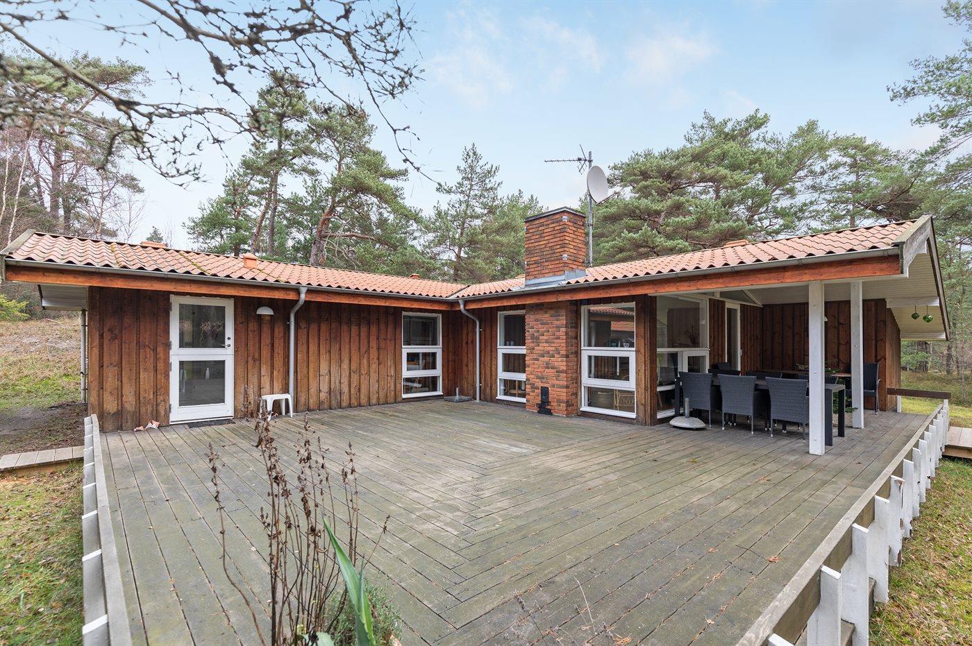 Husets store terrasse giver direkte indblik i naturgrunden, der er let bevokset af både fyrretræer og birketræer.