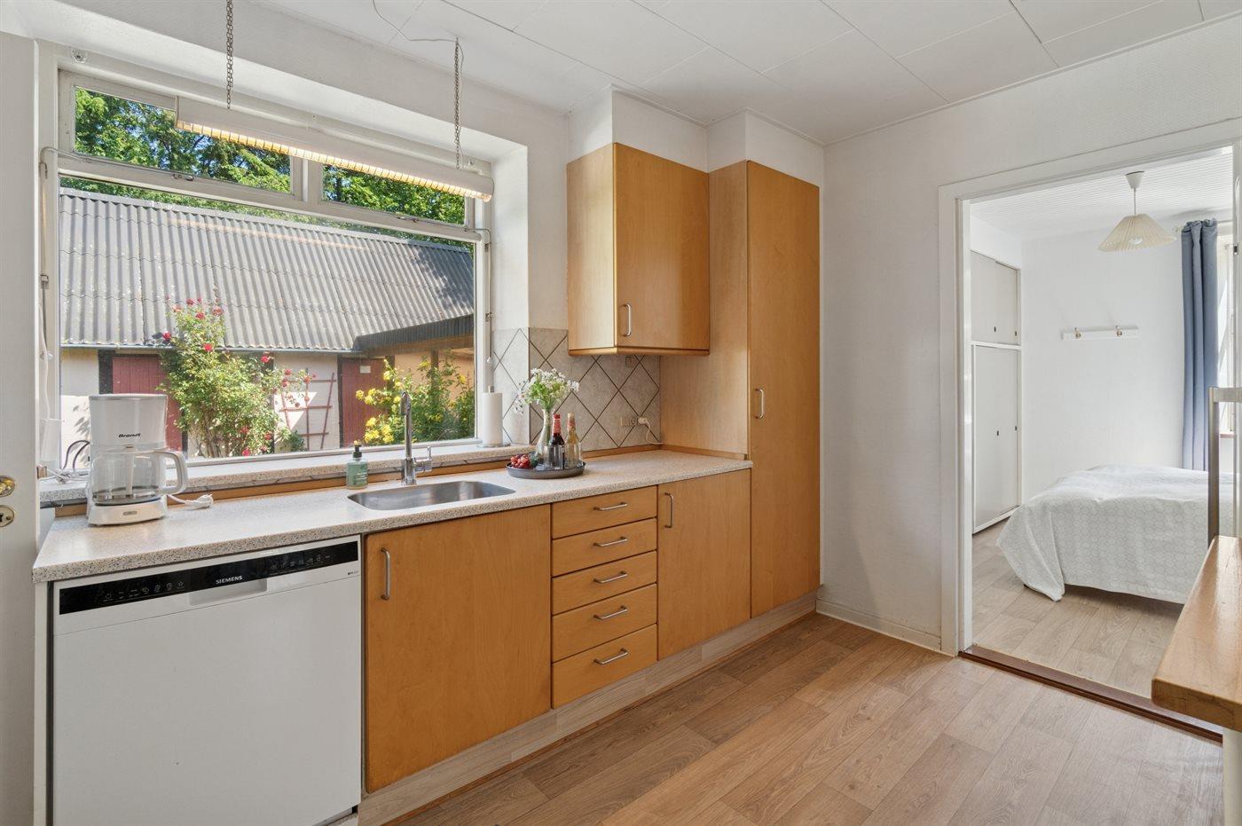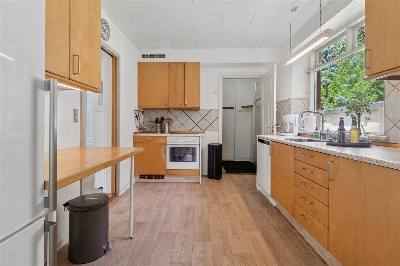 Køkkenet er udstyret med 1 køleskab. Der er 4 elkogeplader, varmluftovn, mikrobølgeovn samt opvaskemaskine.