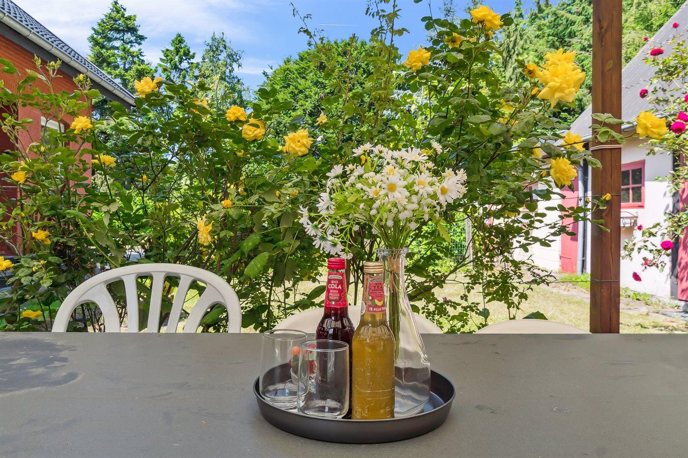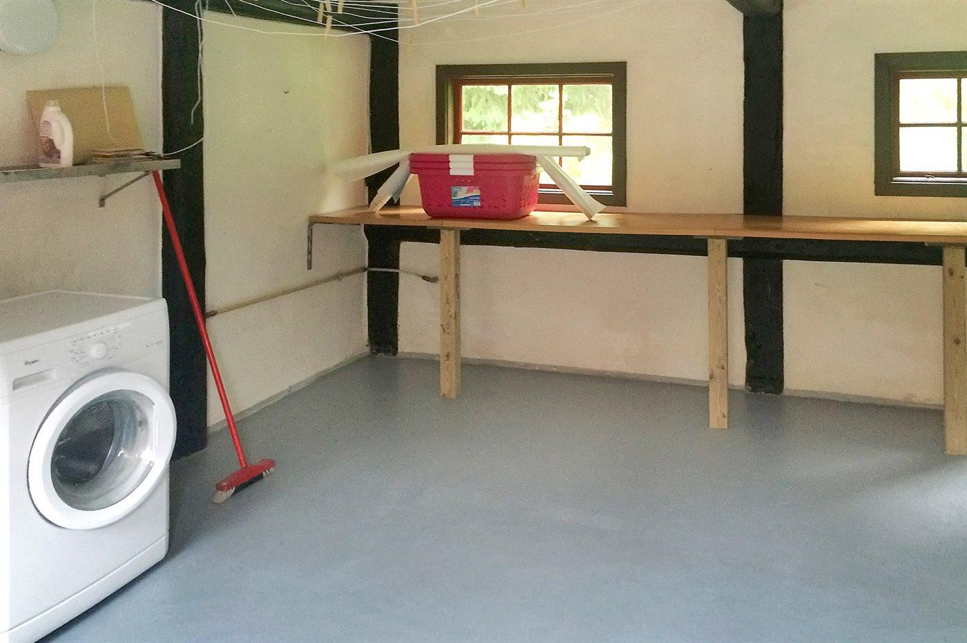 Fra gårdhaven tilgås bryggers med vaskemaskine, her finder du også hynder og puder til alle havemøblerne.