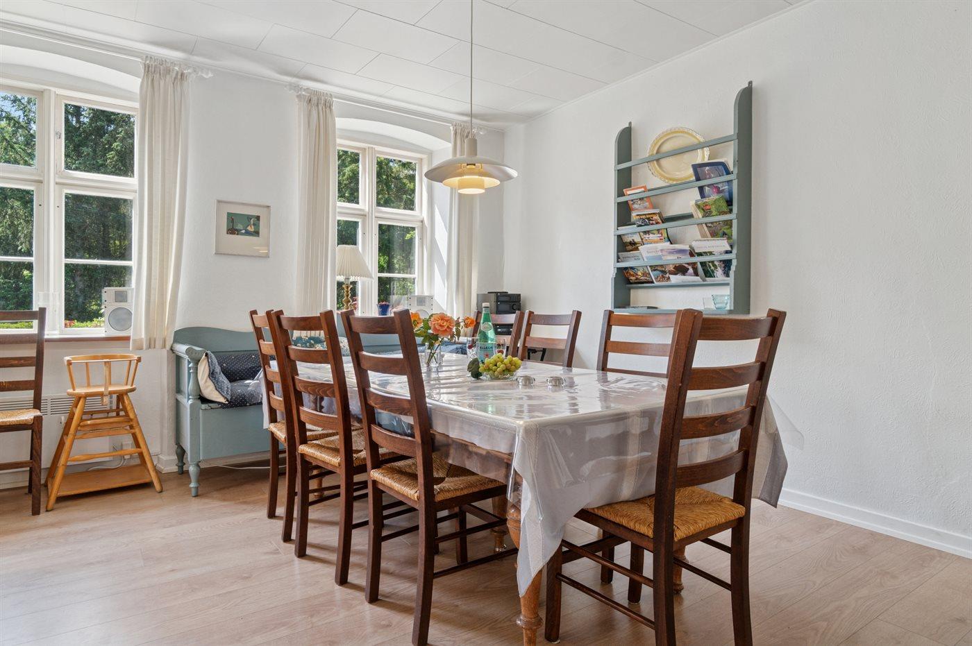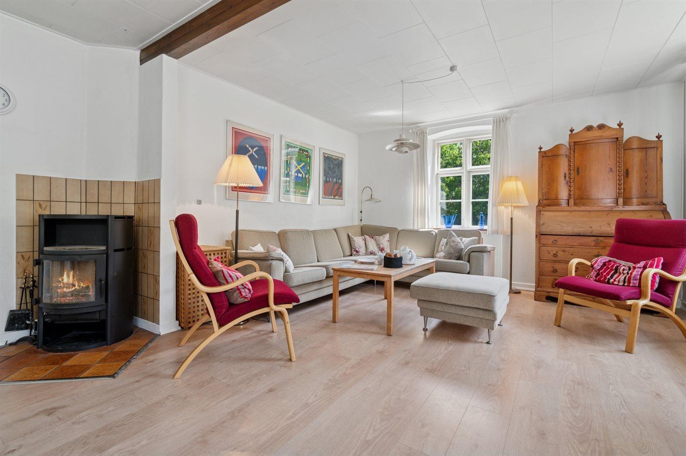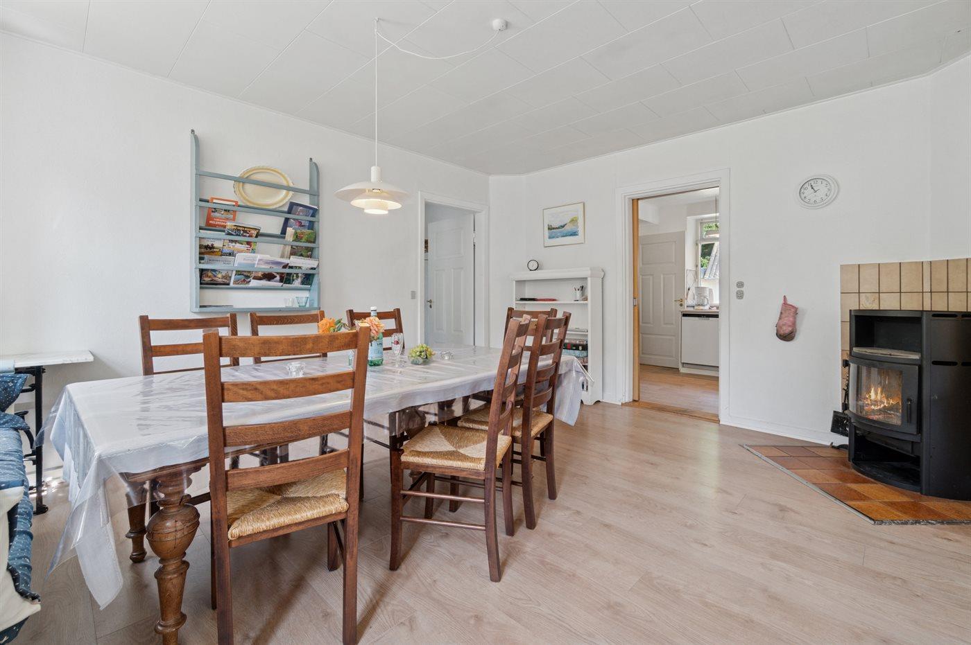 Køkkenet er af ældre dato, men udstyret med alt hvad du har brug for til at bespise 10 personer. Den store stue er det centrale samlingspunkt, med hyggelig spiseplads, opholdsstue og brændeovn.