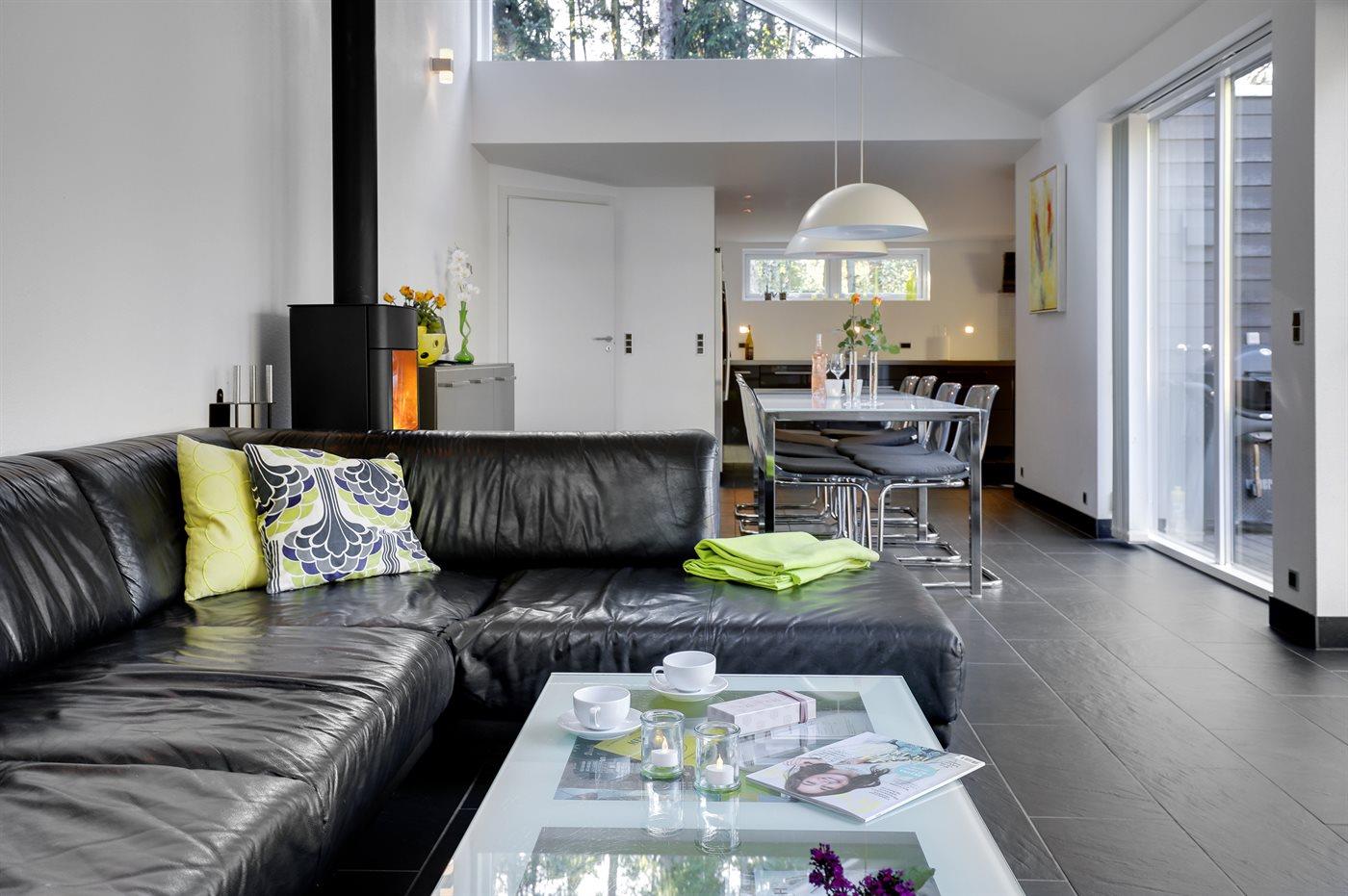 Flot og unikt sommerhus, hvor der er lagt vægt på gennemført kvalitet, spændende arkitektur og velovervejet gedigen indretning. Huset har dejlige lysindfald igennem panoramavinduer, og en særlig dørindretning gør at man kan lukke naturen helt indenfor en varm sommeraften. En skøn træterrasse hører til huset, og på den store grund findes legeområde til børnene.