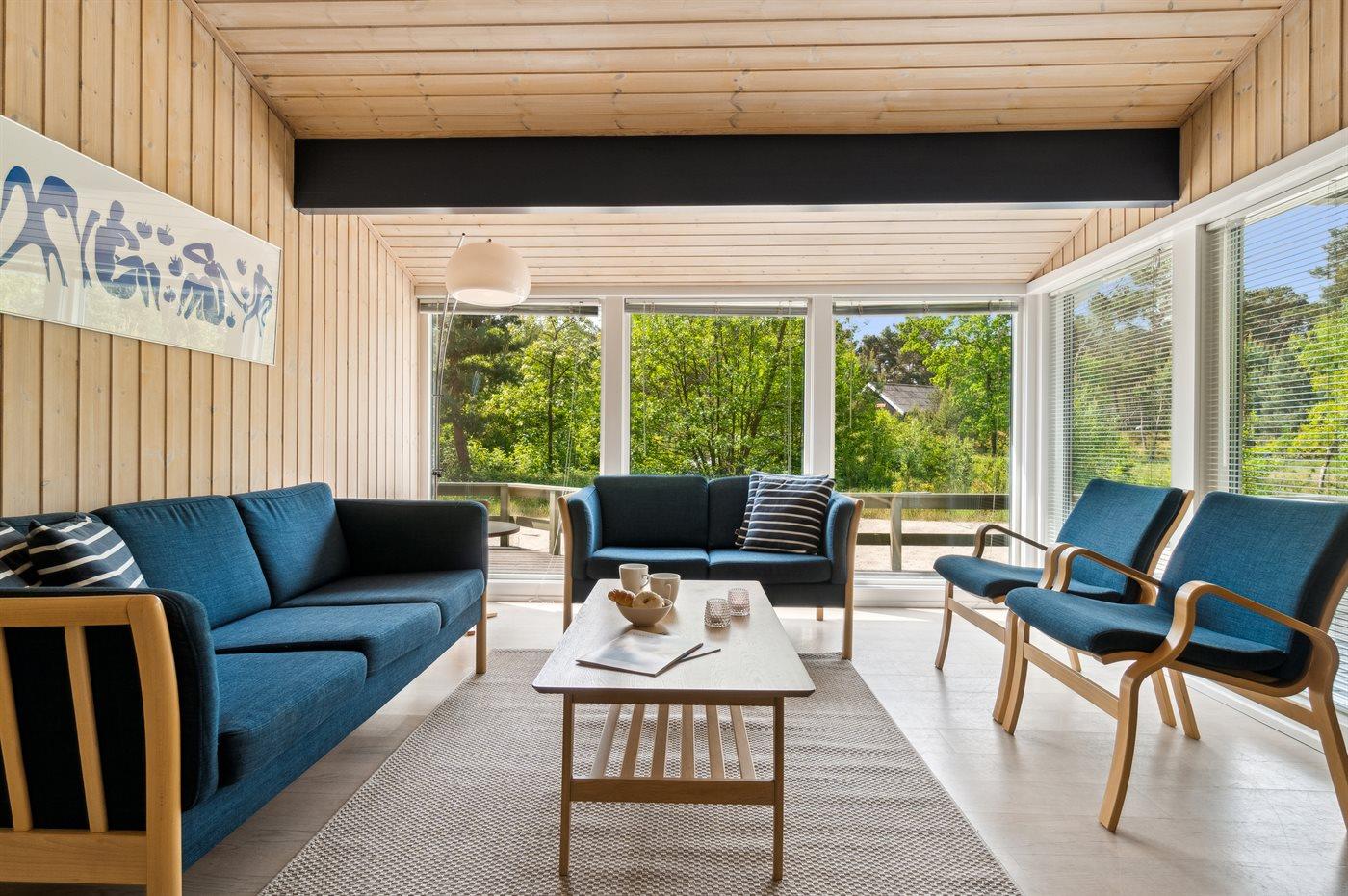 Husets hjerte er stuen, der er godt møbleret med kvalitetsmøbler - lyse gulve, vægge og lofter giver indemiljøet en behagelig fornemmelse. Veludstyret køkken med spiseafdelingen tæt på, så serveringen kan foregå let, når familien samles. Alt i alt byder huset på en god og ubekymret ferieoplevelse - der både kan foregå indendørs, hvis vejret er til det, og ellers på de store træterrasser, der er delvis overdækket. Den flotte sandstrand ved Jomfrugård indbyder til en badetur eller blot at nyde solen i de smukke omgivelser.