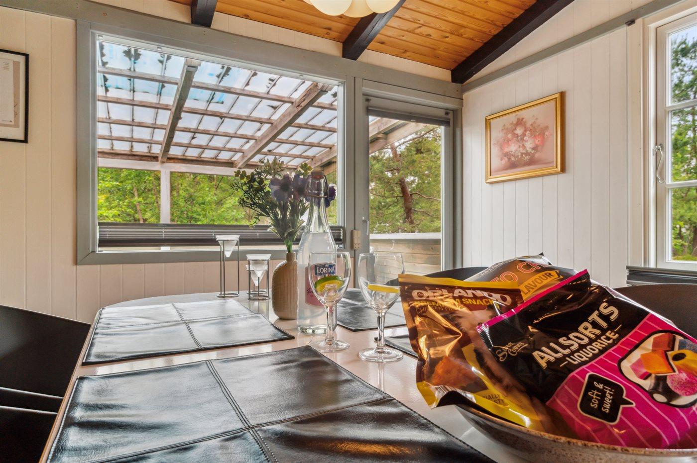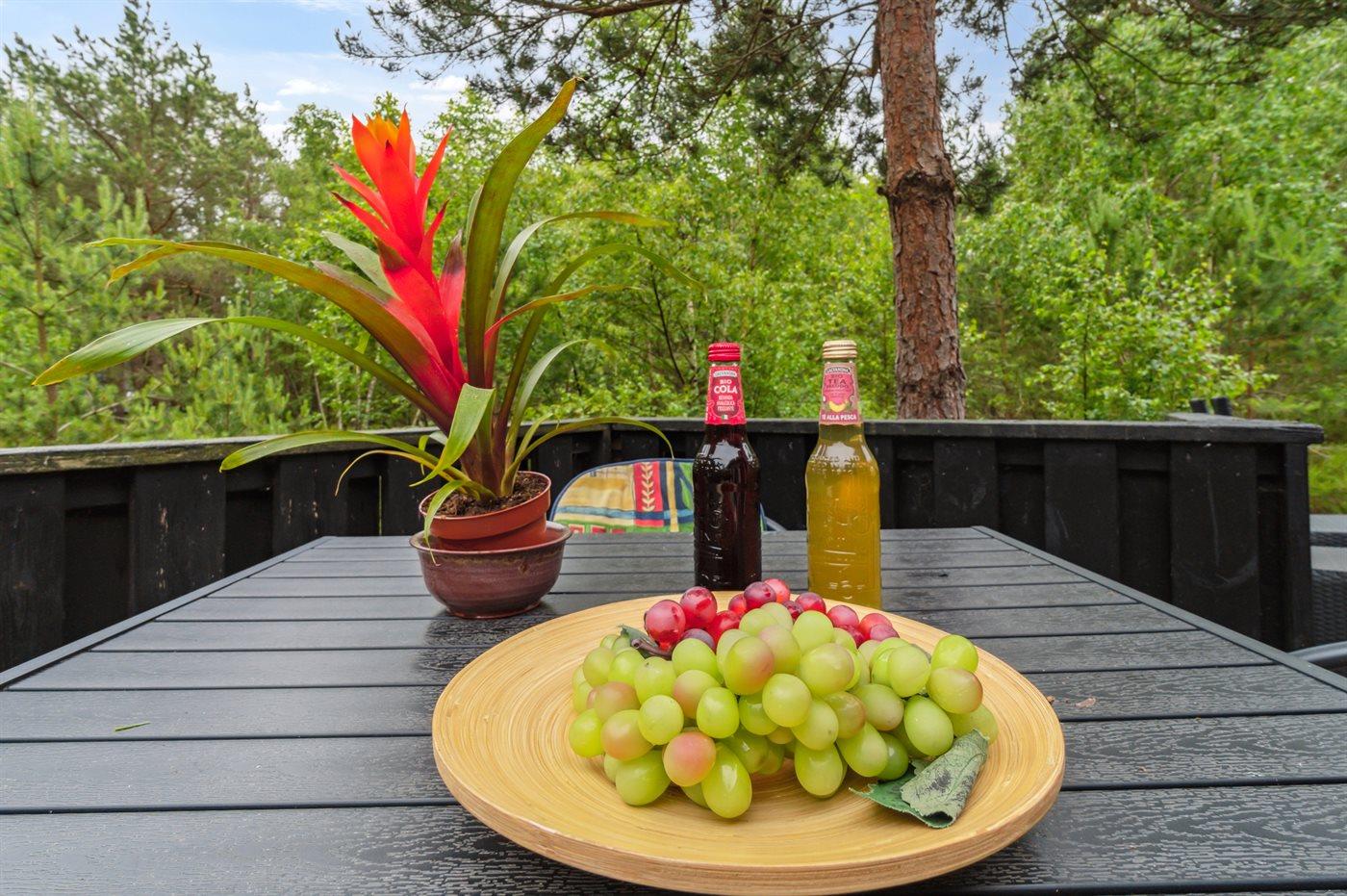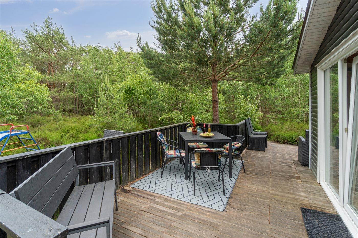 Den overdækkede terrasse giver læ og giver mulighed for at strække aftenerne i hyggeligt samvær. Den åbne terrasse er afskærmet af bevoksningen, så solen kan nydes i fred og ro.
