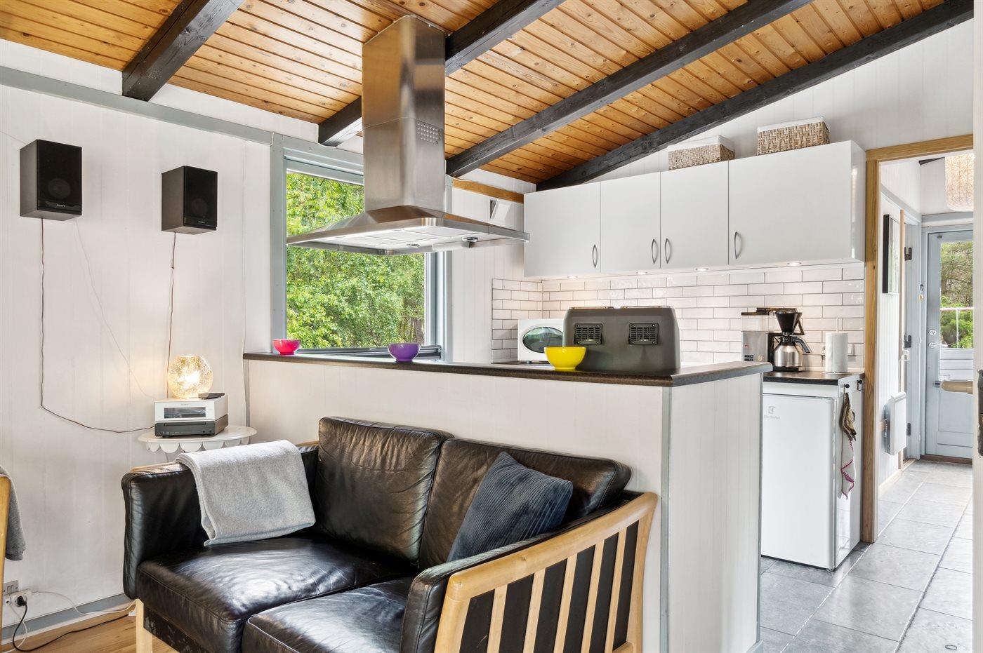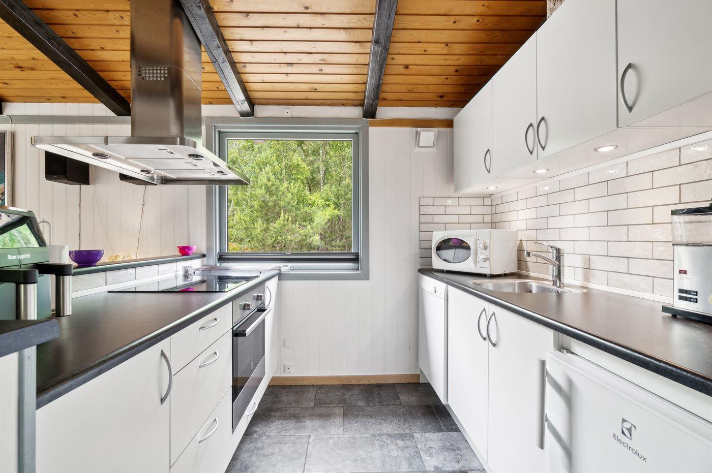 Køkkenet er udstyret med 1 køleskab. Der er 4 keramiske kogeplader, varmluftovn, mikrobølgeovn samt opvaskemaskine.