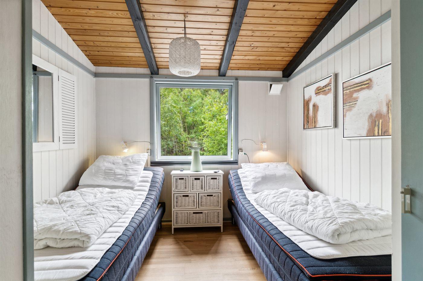 Der er i alt 2 soveværelser. Sovepladserne fordeler sig på: 2 sovepladser i dobbeltseng.2 sovepladser i elevationssenge. Derudover er der 1 stk. barneseng.