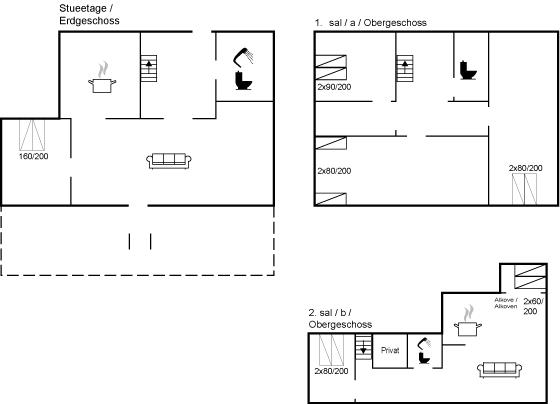 Der er i alt 5 soveværelser. Sovepladserne fordeler sig på: 8 sovepladser i dobbeltsenge. 2 sovepladser i enkeltsenge. 2 sovepladser i alkove. 2 af disse sovepladser befinder sig i stuen.