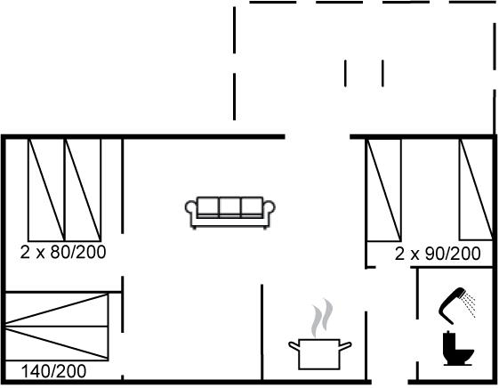 Der er i alt 3 soveværelser. Sovepladserne fordeler sig på: 4 sovepladser i dobbeltsenge. 2 sovepladser i enkeltsenge.