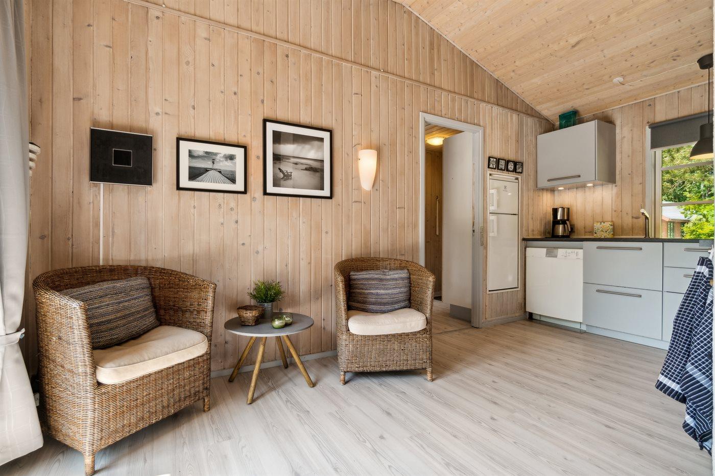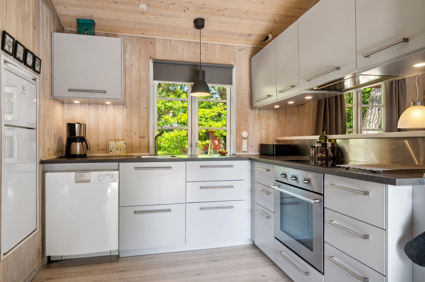 Køkkenet er udstyret med 1 køleskab. Der er 4 keramiske kogeplader, varmluftovn samt opvaskemaskine.