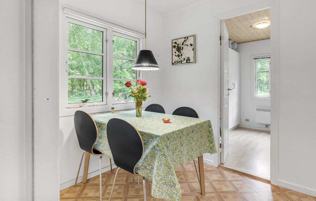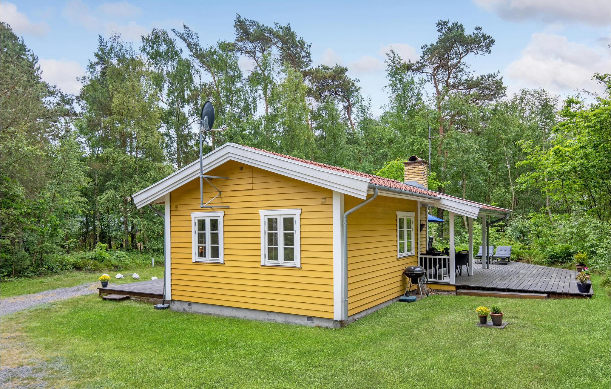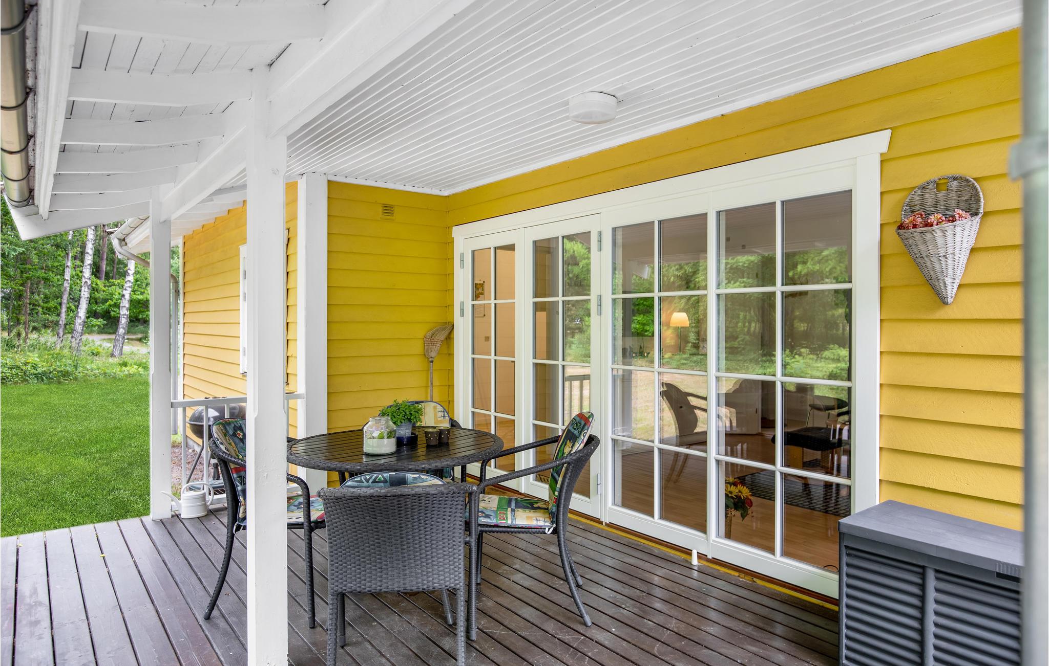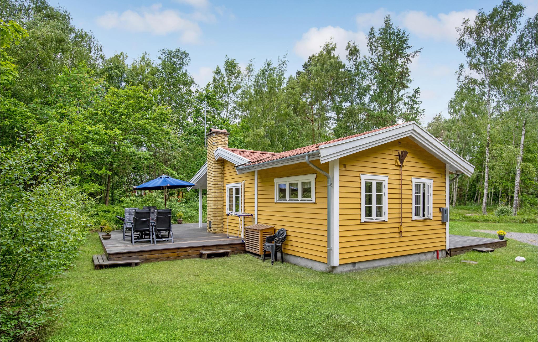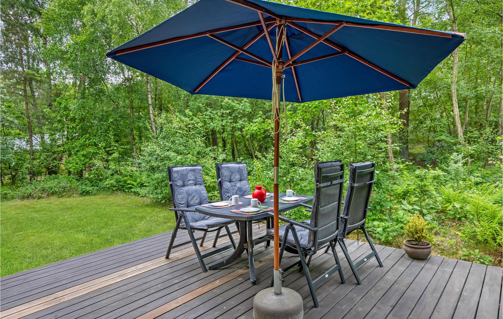 Hyggeligt træhus nær Dueoddes strand på Bornholm med åben og overdækket terrasse, perfekt til sol- og strandelskere.