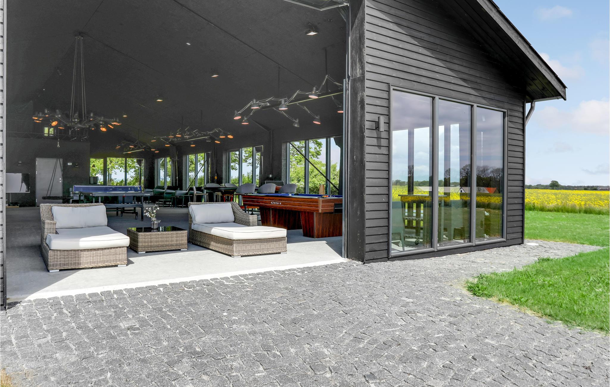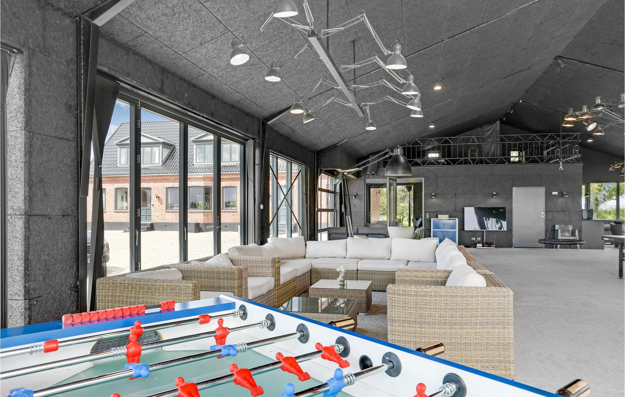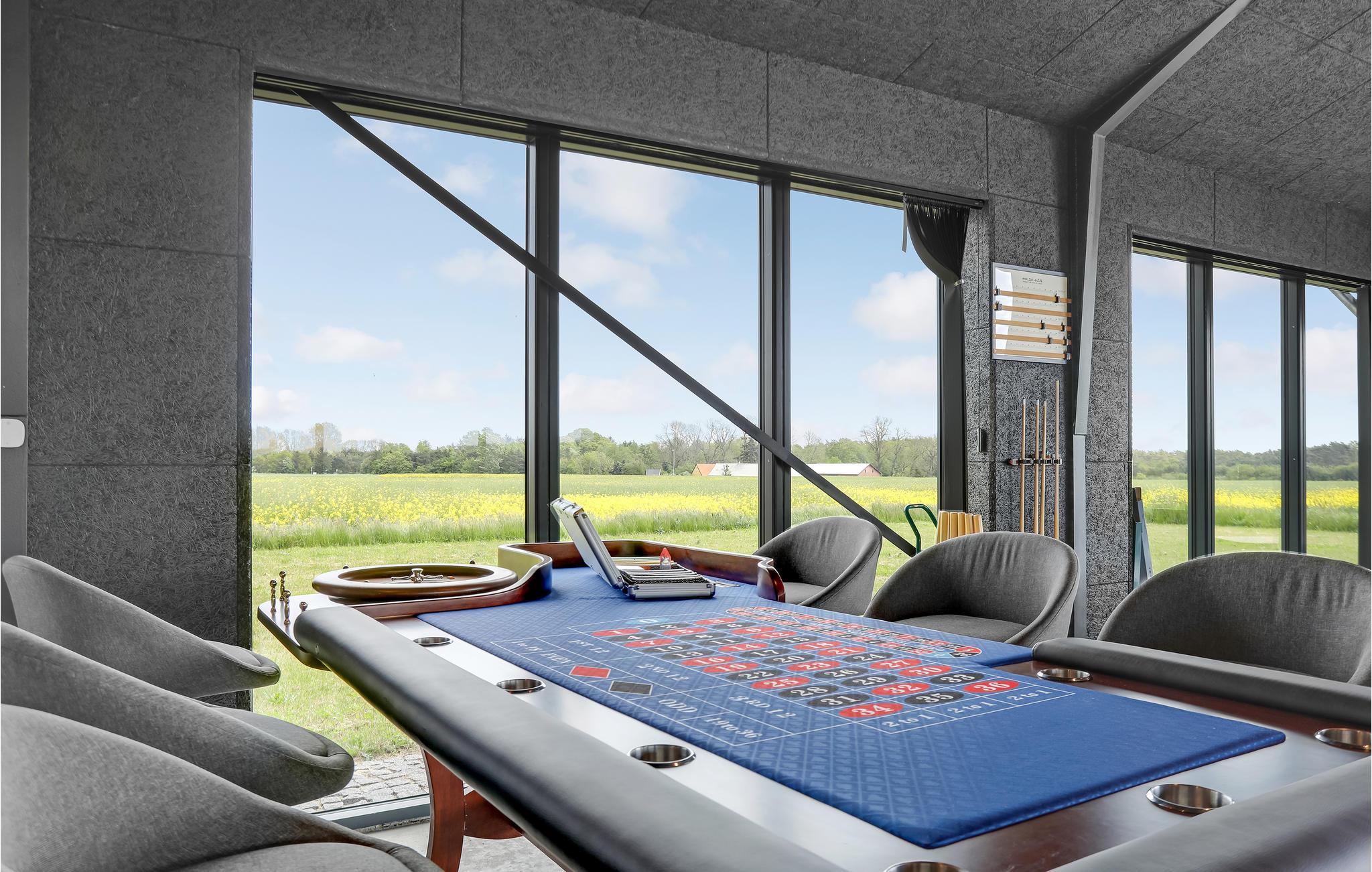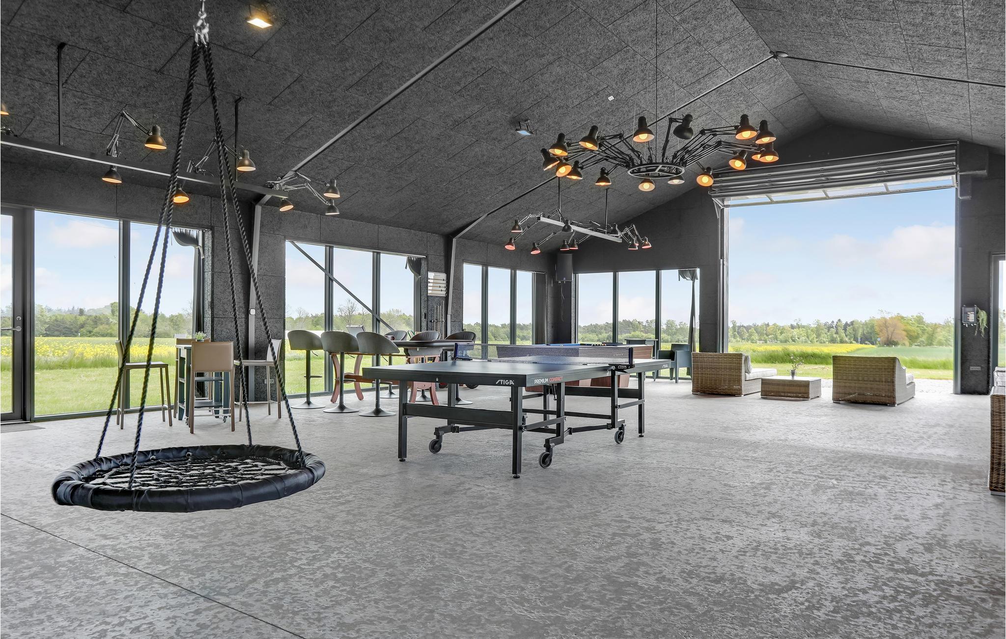 Ved siden af hovedbygningen ligger det 240 m² store, topmoderne multifunktionshus, hvor I kan muntre jer med bordtennis og bordfodbold. Her findes endvidere et køkken, badeværelse med pusleplads samt et gæstetoilet. Fra de mange, store vinduespartier har I en fantastisk udsigt til marker og det flotte landskab. Rundt om huset findes flere dejlige terrasser med lækre kvalitetshavemøbler i flot design, en af terrasserne ligger ud til den hyggelige gårdsplads. Der er god mulighed for leg, boldspil og aktiviteter af enhver slags på den kæmpestore græsplæne.