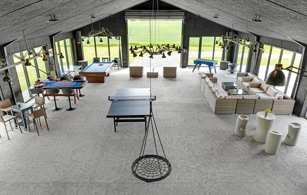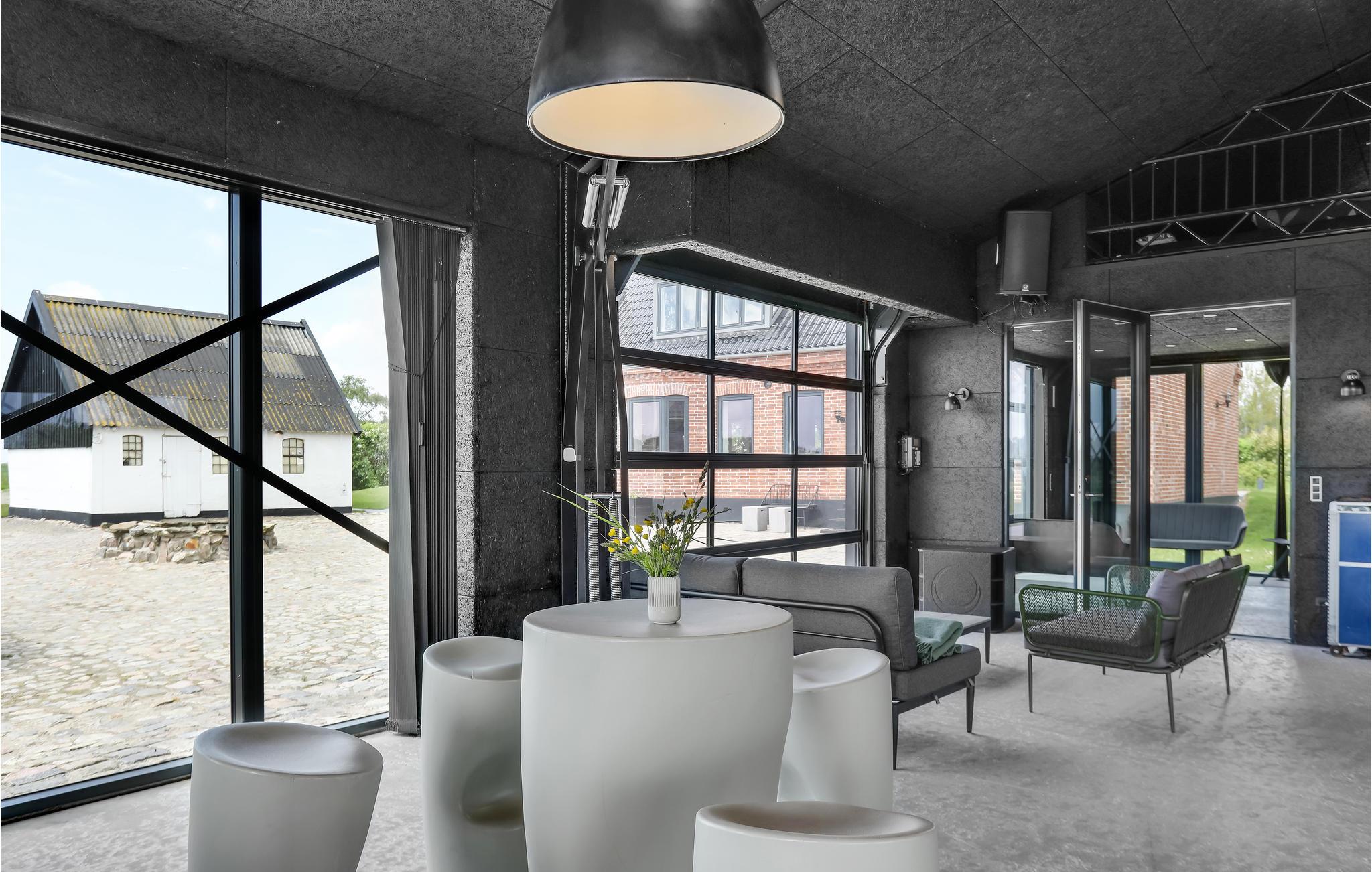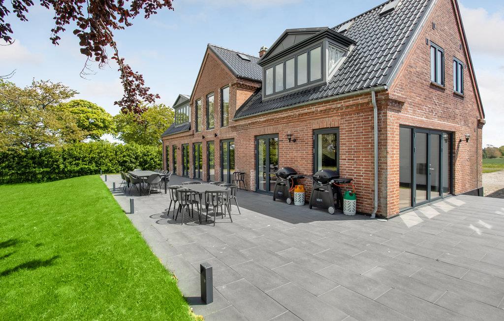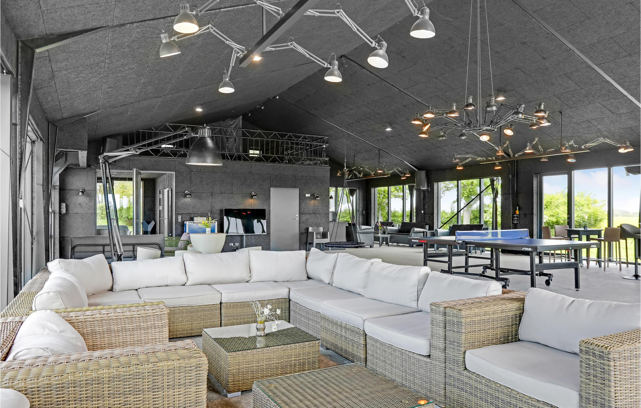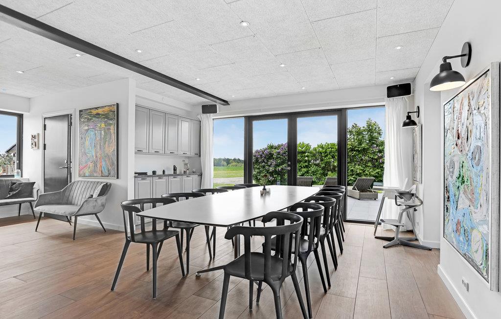Ved siden af hovedbygningen ligger det 240 m² store, topmoderne multifunktionshus, hvor I kan muntre jer med bordtennis og bordfodbold. Her findes endvidere et køkken, badeværelse med pusleplads samt et gæstetoilet. Fra de mange, store vinduespartier har I en fantastisk udsigt til marker og det flotte landskab. Rundt om huset findes flere dejlige terrasser med lækre kvalitetshavemøbler i flot design, en af terrasserne ligger ud til den hyggelige gårdsplads. Der er god mulighed for leg, boldspil og aktiviteter af enhver slags på den kæmpestore græsplæne.