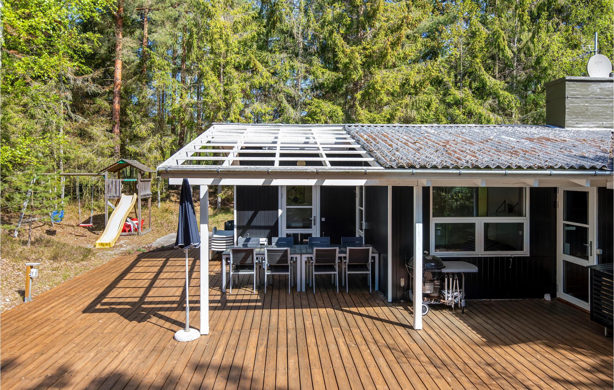 Velkommen til dette rummelige og hyggelige sommerhus af træ, hvor der er god plads til to familier. Huset ligger på en rolig naturgrund og har en pragtfuld stor åben træterrasse, hvor I kan tilbringe mange gode timer med afslapning og hygge fra tidlig morgen til sen aften. I huset er der et dejligt åbent køkken, et stort bryggers og en god opholdstue med brændeovn. Huset har en dejlig beliggenhed i attraktive grønne omgivelser og ikke langt fra en dejlig sandstrand, gode cykelveje og en lille svømmehal.