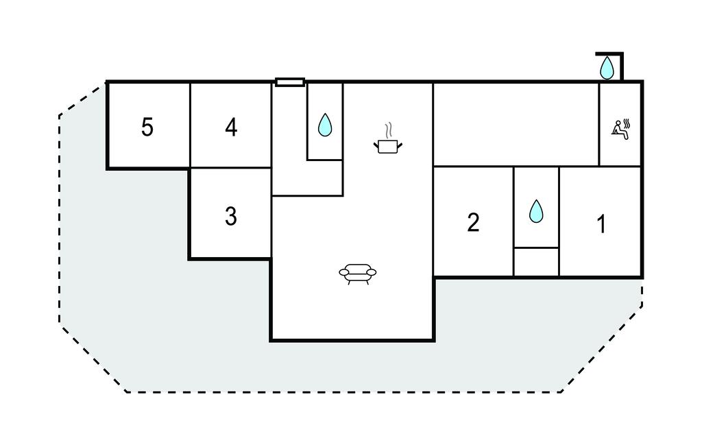Bemærk, at adgang til soveværelse 5 går via terrassen.