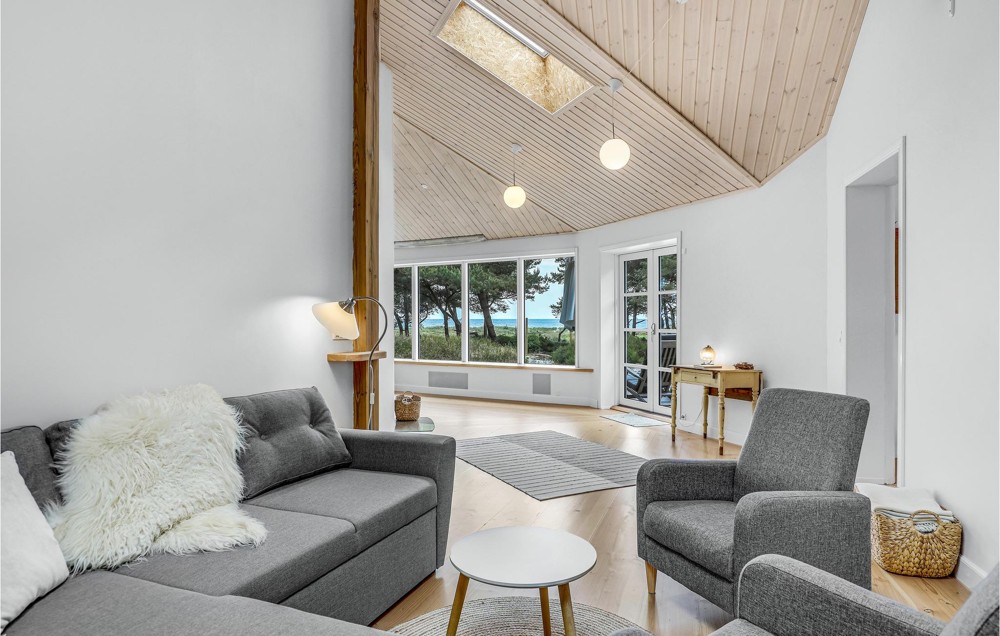 Charmerende træsommerhus i 1. række til sandstrand med havudsigt og privat sauna, perfekt til en unik ferieoplevelse på Bornholm.