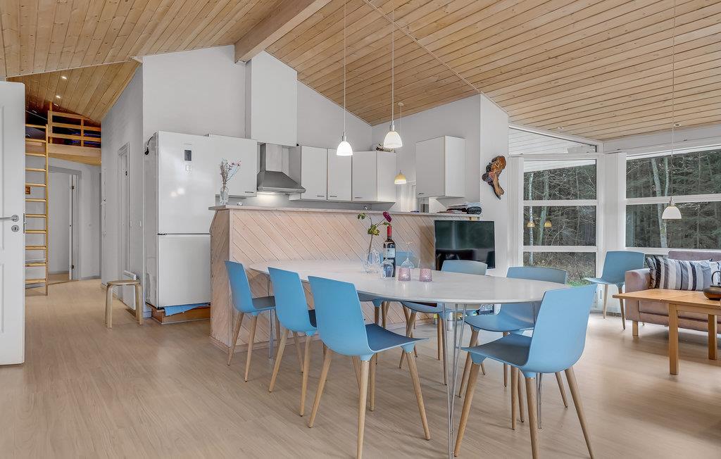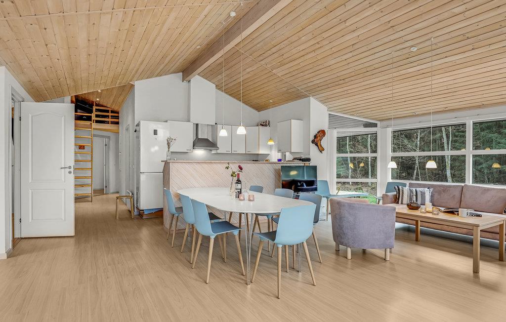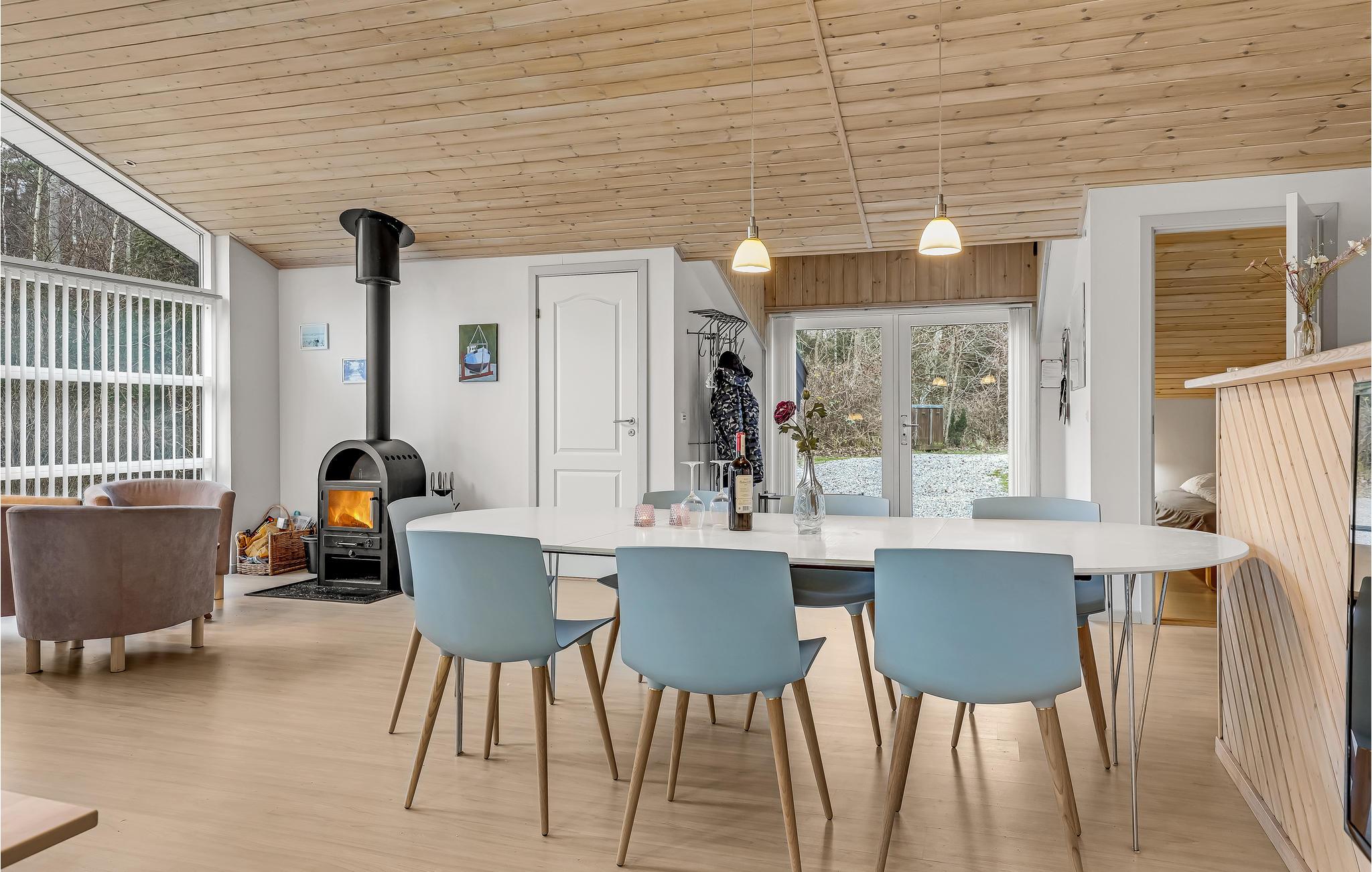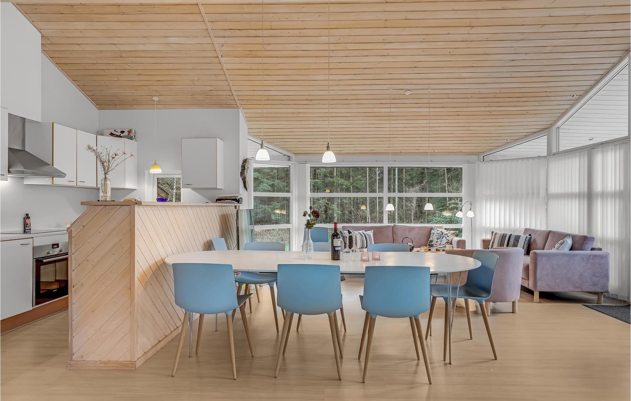 Glæd jer til et afslappende og fornøjeligt ophold i dette skønne feriehus, som er lækkert og moderne indrettet. Husets hjerte er den rummelige stue med åbent køkken. Loftet går til kip og de store gulv til loft-vinduer giver en behagelig og åben atmosfære. Sammensæt dagens lækre måltider i køkkenet, mens I taler med gæsterne i stuen. Spisebordet står placeret centralt i rummet, så her kommer I sikkert til at give jer god tid omkring måltiderne, mens I nyder udsigten til haven og ilden i brændeovnen.