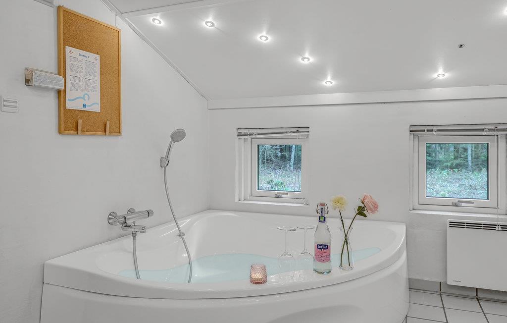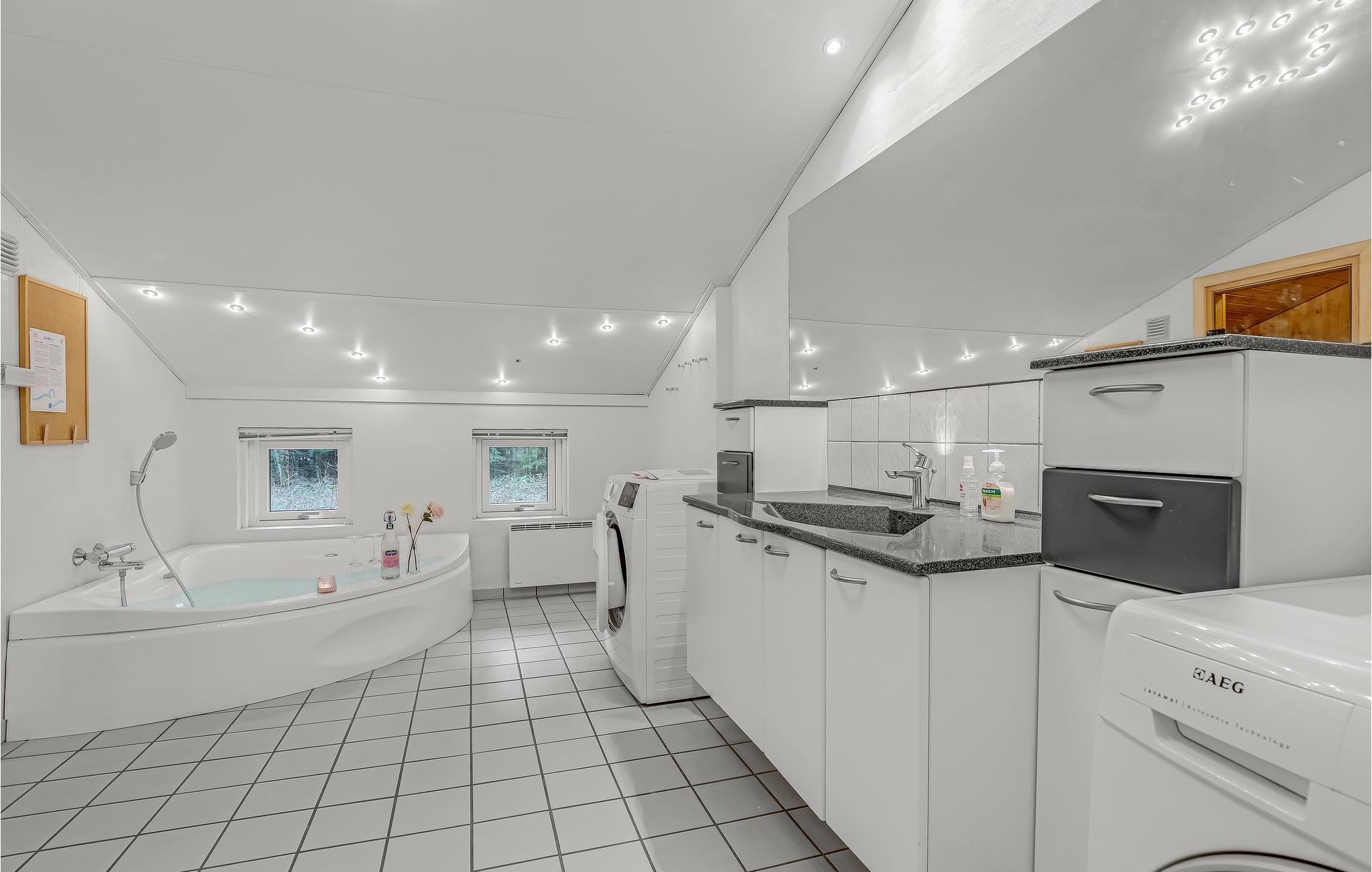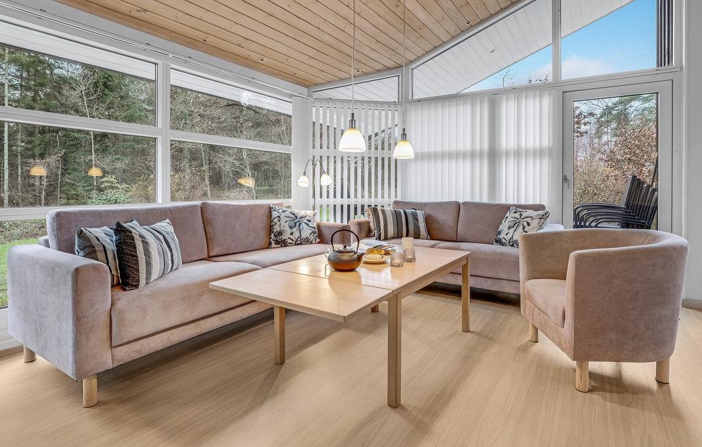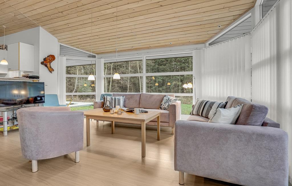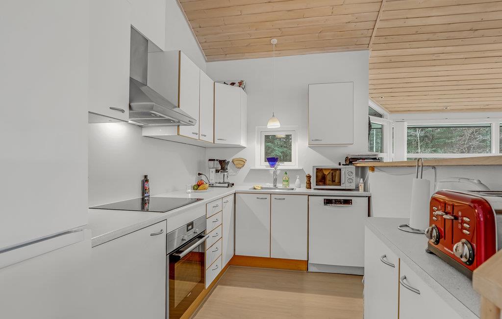 Glæd jer til et afslappende og fornøjeligt ophold i dette skønne feriehus, som er lækkert og moderne indrettet. Husets hjerte er den rummelige stue med åbent køkken. Loftet går til kip og de store gulv til loft-vinduer giver en behagelig og åben atmosfære. Sammensæt dagens lækre måltider i køkkenet, mens I taler med gæsterne i stuen. Spisebordet står placeret centralt i rummet, så her kommer I sikkert til at give jer god tid omkring måltiderne, mens I nyder udsigten til haven og ilden i brændeovnen.
