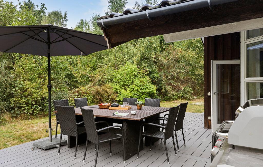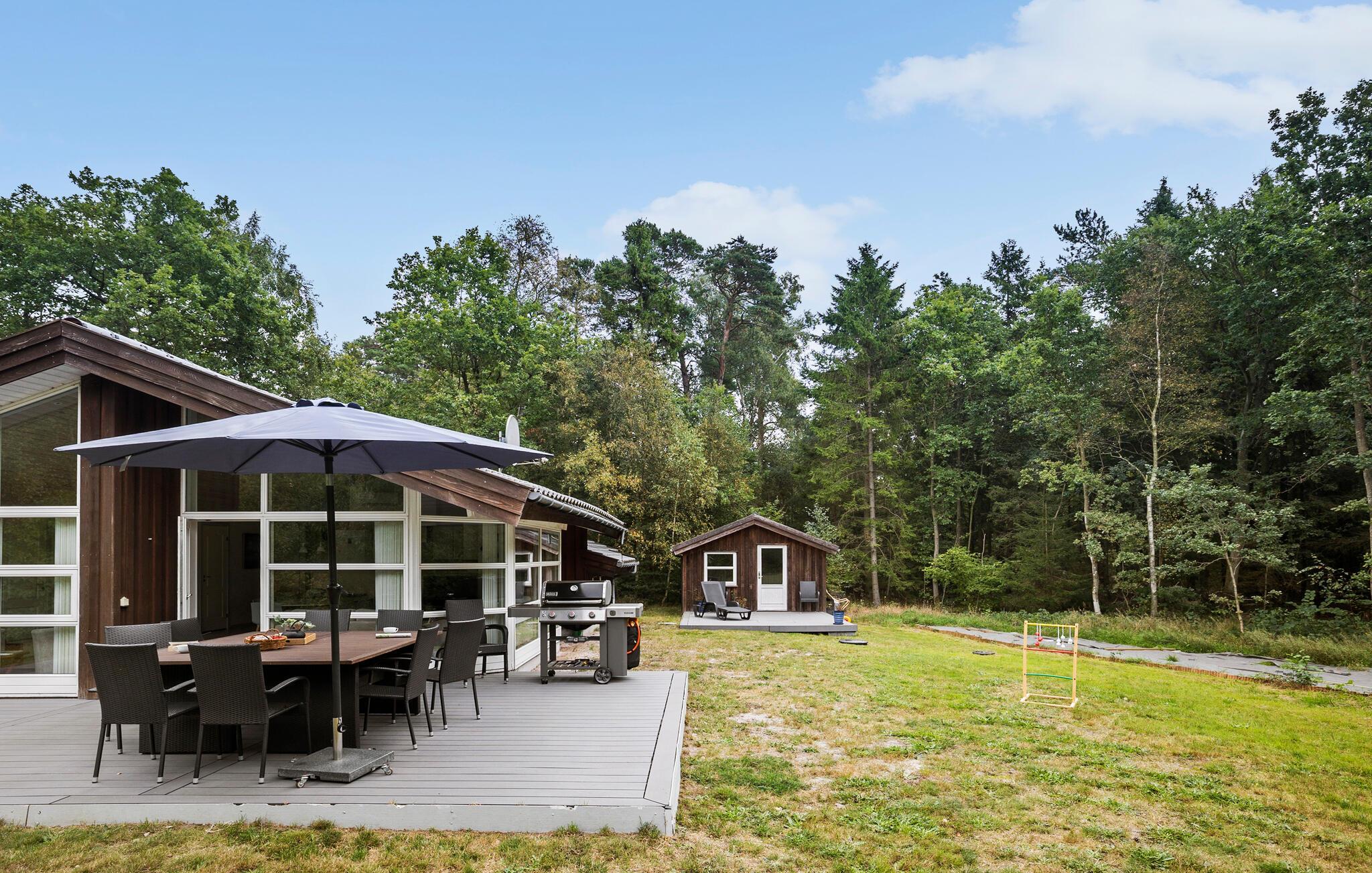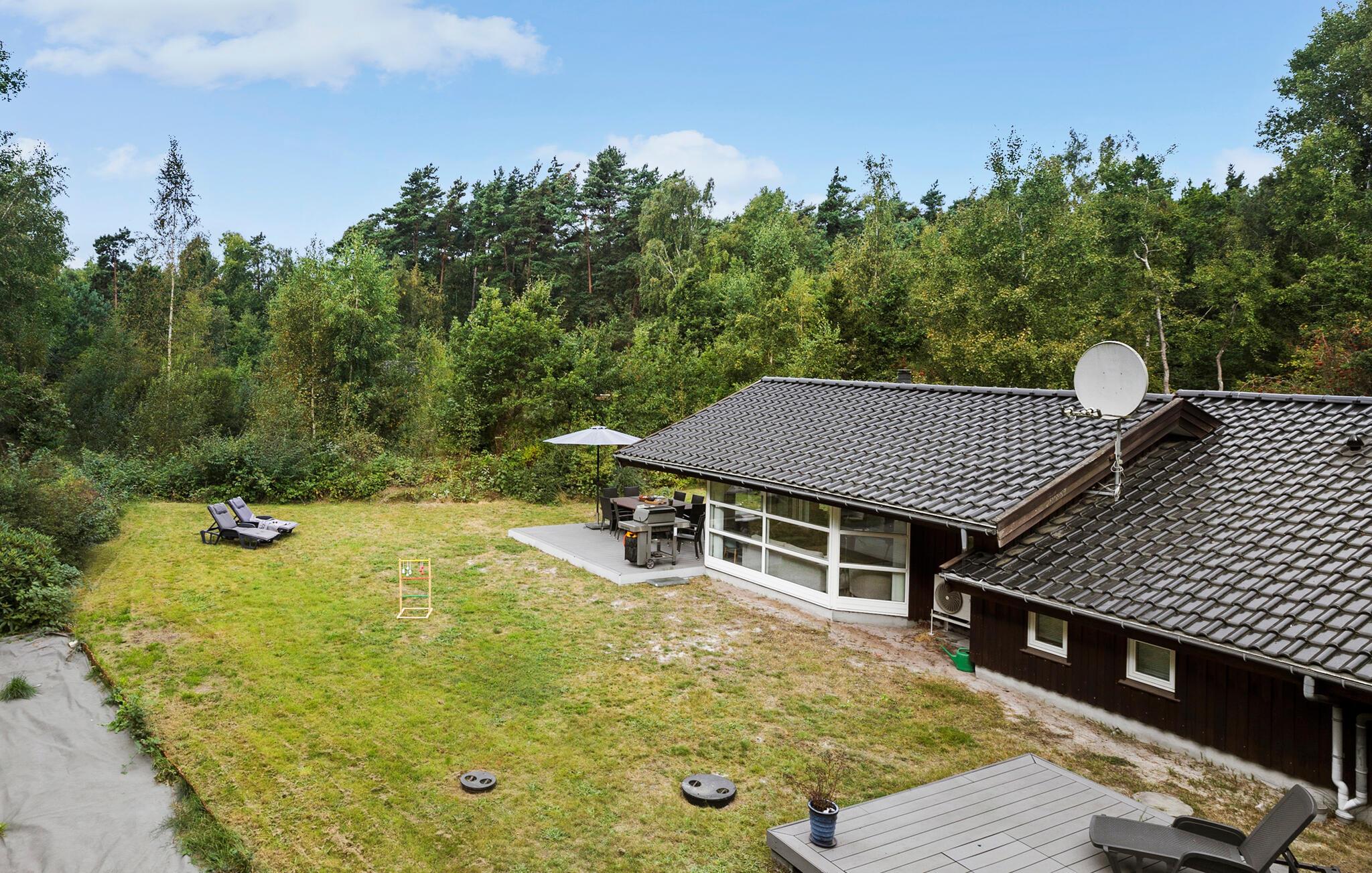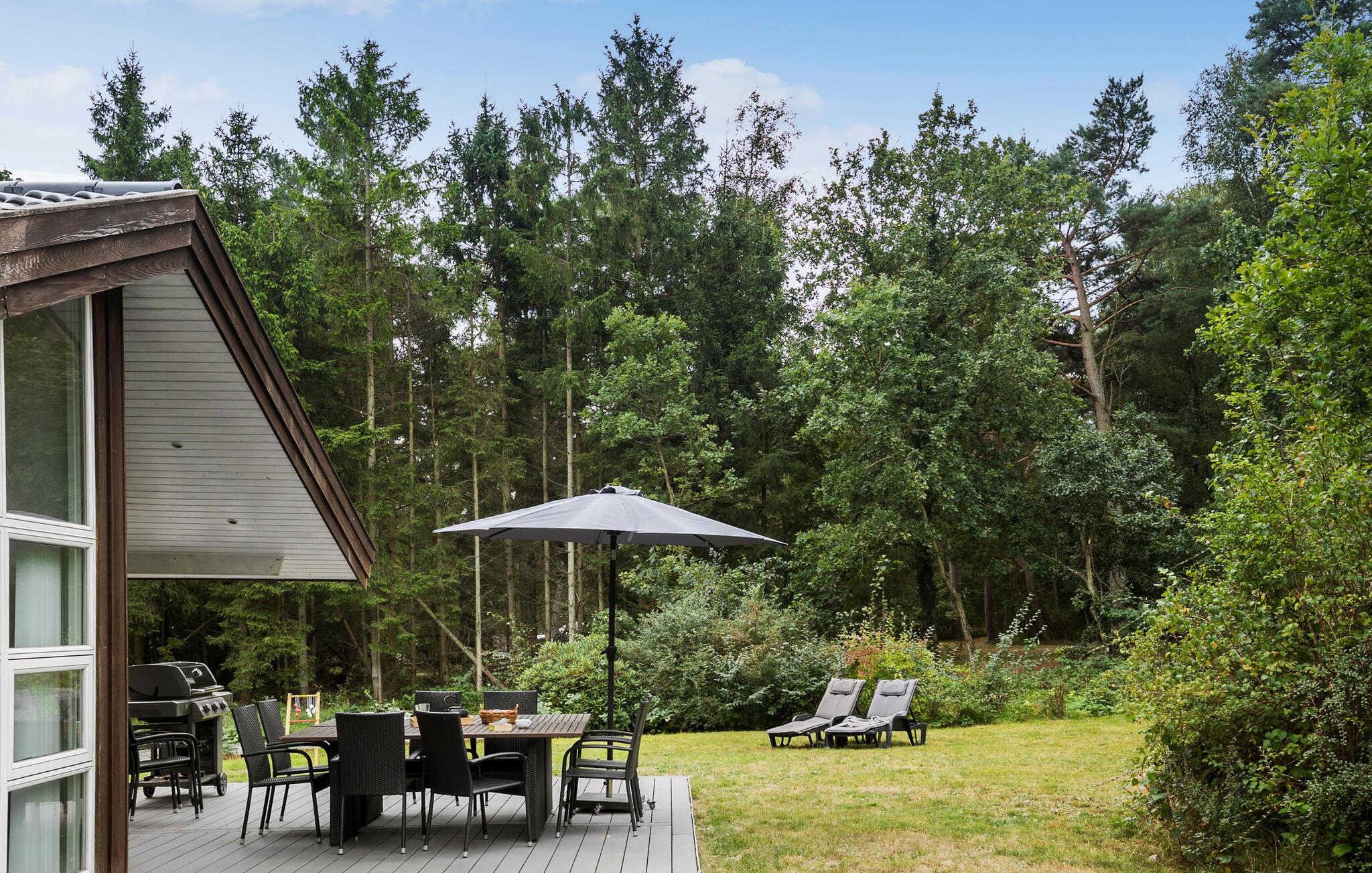 Så snart solen er fremme, kan I sætte jer ud på den store terrasse og kigge ud over haven, der omkranses af træer. Hvis I er friske på en dukkert, kan I gå direkte ned på stranden i jeres badetøj og vende tilbage til haven for at tørre i solen.