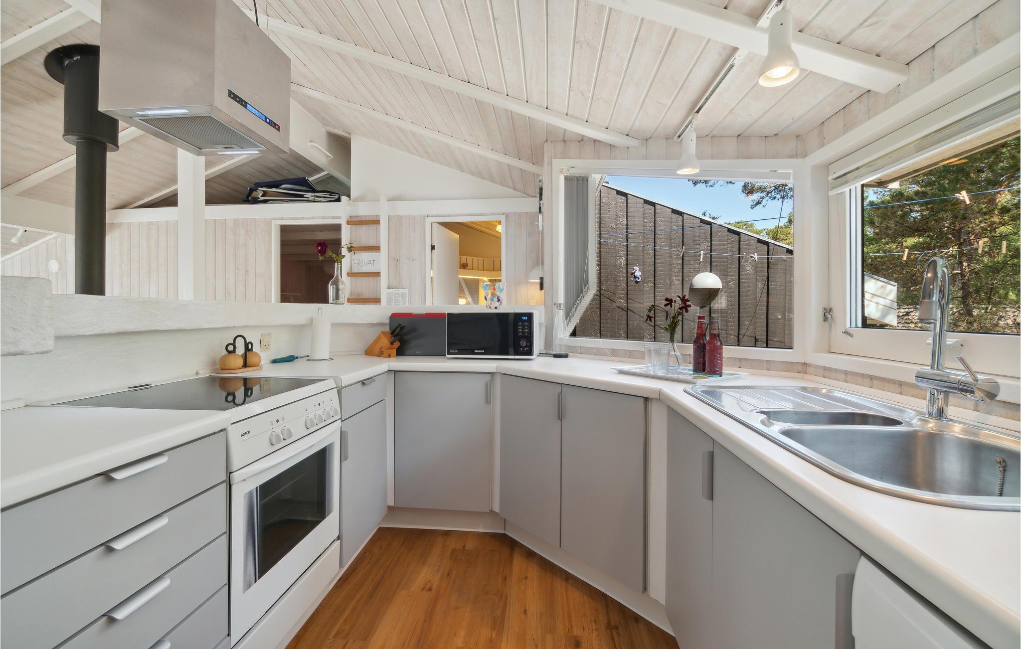 Tilbring afslappende dage i dette indbydende træhus, der kombinerer komfort og hygge. Kun en kort gåtur fra havet kan I nyde en dejlig ferie i stilfulde omgivelser – ideelt for familier og par, der søger natur og afslapning. Træd ind i den rummelige opholdsstue med brændeovn, der skaber en varm atmosfære. Gør det behageligt i sofaen, se en film eller nyd blot den knitrende ild. Et par trin fører til det åbne, veludstyrede køkken, hvor I kan lave mad og spise sammen. Husets sauna lægger op til at nyde øjeblikke med beroligende ro.
