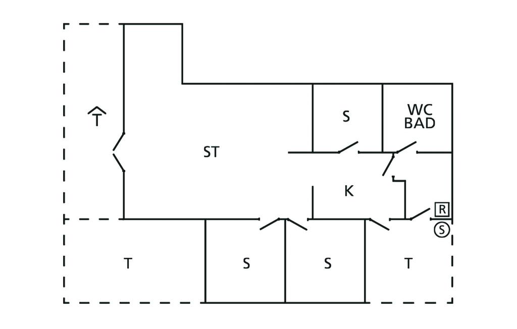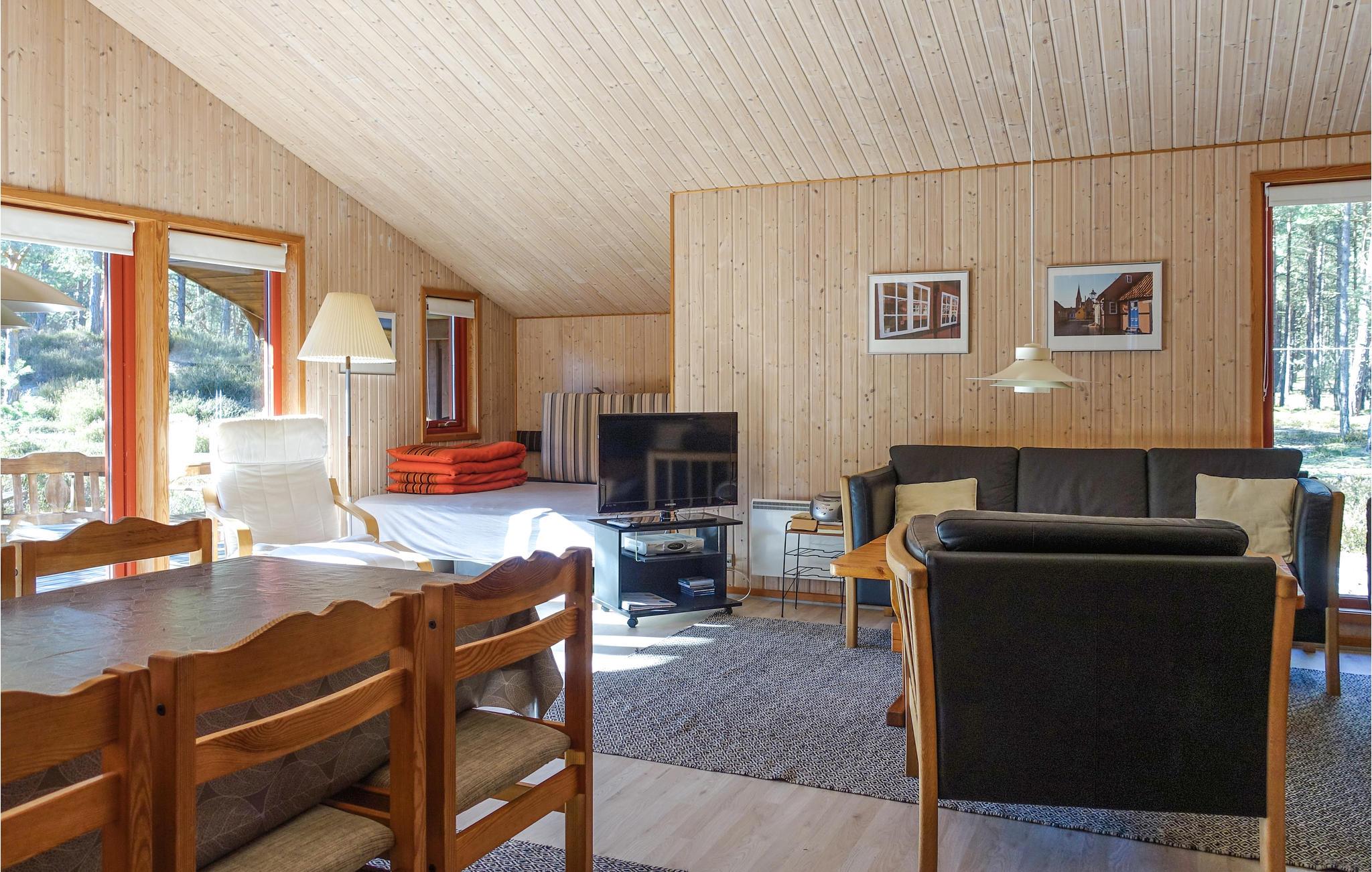 Trægulve, vægge- og lofter i kombination med åbent til kip giver den rummelige opholdsstue charme og en hyggelig atmosfære. Her kan I se fjernsyn, høre radio eller musik og om vinteren nyde varmen fra brændeovnen. I forbindelse med opholdsstuen ligger det åbne køkken, således at feriens kok eller kokke kan holdes med selskab under madlavningen. Der er vaskemaskine og gulvvarme på badeværelset.