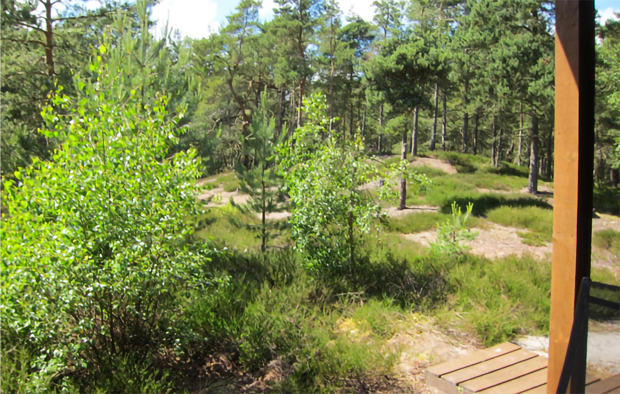Skønt sommerhus i træ på en flot, kuperet og skovklædt naturgrund, som ligger direkte ved et fredet område med klitter og nær Dueoddes skønne sandstrand.