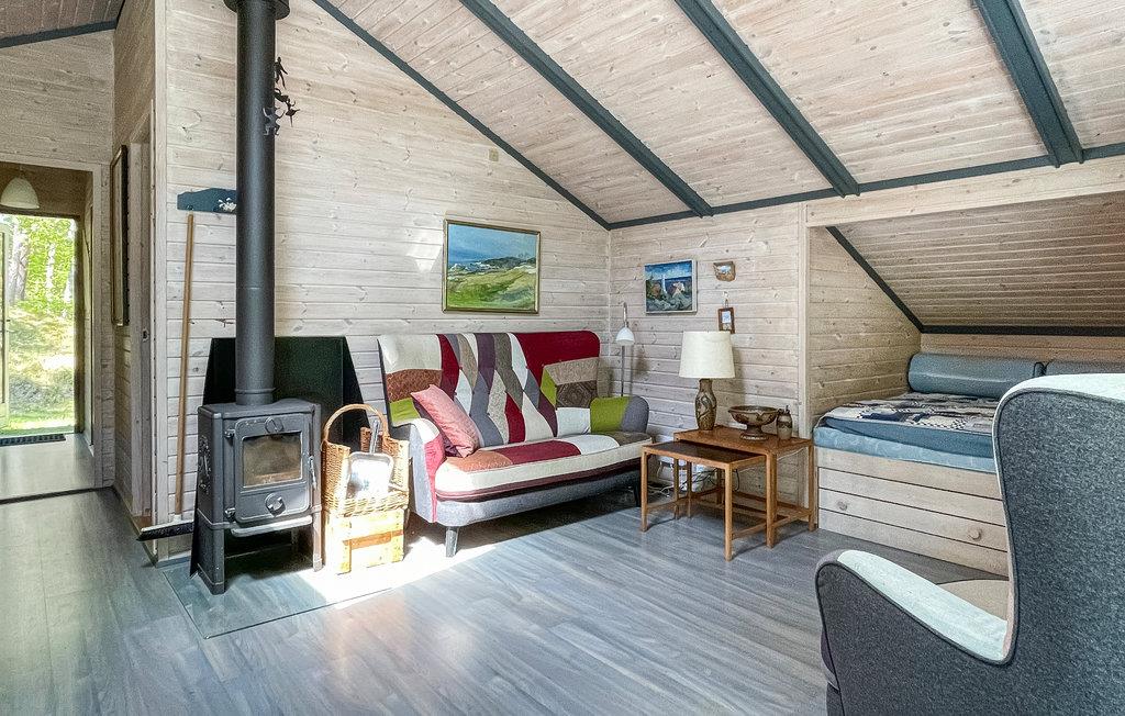 Velkommen til dette charmerende og lyse feriehus, der med sin trægulve, vægge- og lofter i kombination med åbent til kip har en rummelig og hyggelig atmosfære. I den smagfuldt indrettede opholdsstue kan I se fjernsyn, høre radio eller musik, samles om spisebordet og om vinteren nyde varmen fra brændeovnen (brænde er inkl.). Der er også en dejlig alkove i stuen. Det åbne, veludstyrede køkken ligger i forbindelse med stuen, således at feriekokken/kokkene kan holdes med selskab. Derudover består huset af et fint badeværelse og to gode soveværelser.