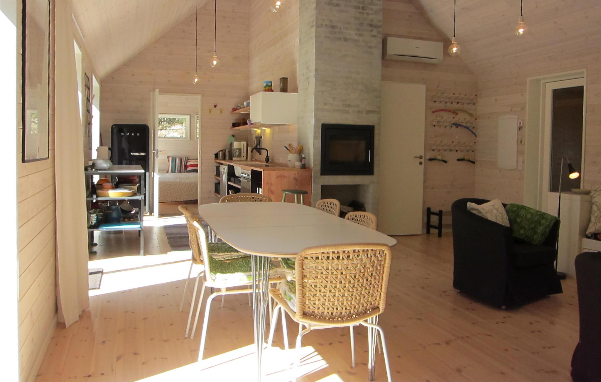 Opholdsrummet har en varm og dejlig atmosfære med den lyse farve fra loftet og trægulvet. Her kan I hygge jer med madlavningen i det åbne køkken, mens ilden buldrer i den flotte integrerede pejs, og børnene spiller kort ved bordet.