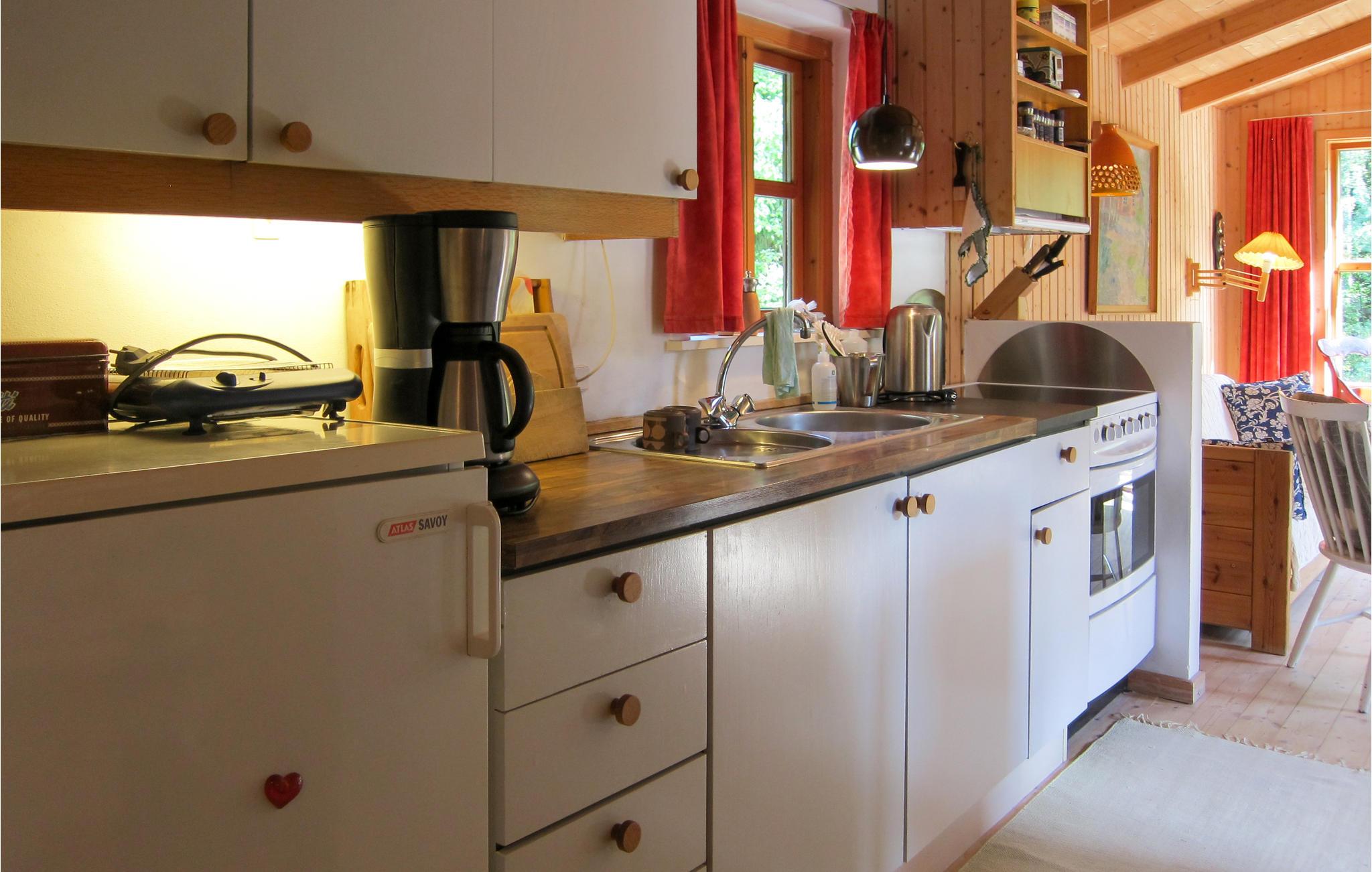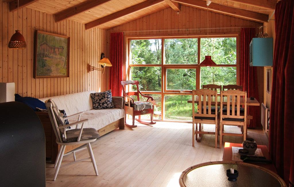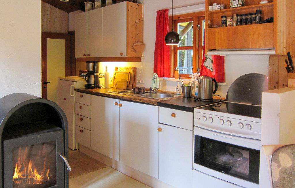 Opholdsrummet har en varm og dejlig atmosfære, hvor I kan hygge jer med madlavningen i det åbne køkken, mens ilden buldrer i brændeovnen, og børnene spiller kort ved bordet.