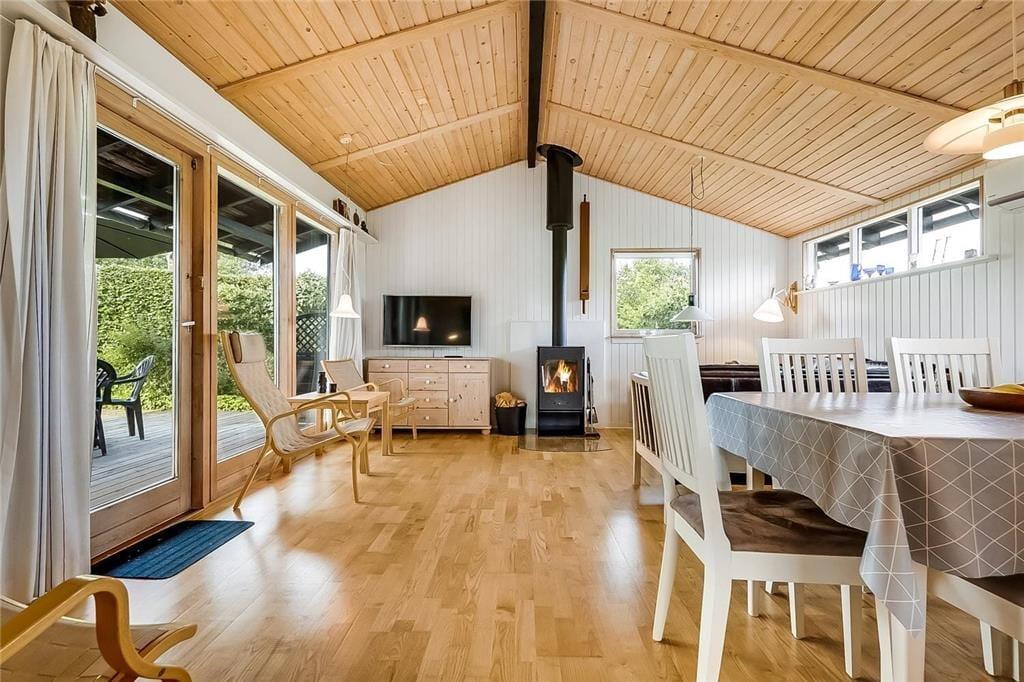 Træd ind i dette stemningsfyldte sommerhus, hvor hvert hjørne emmer af ro og hygge. Det smukke køkken/alrum åbner dørene til en verden af varme og samvær, hvor brændeovnens knitrende og familiens latter blander sig harmonisk.