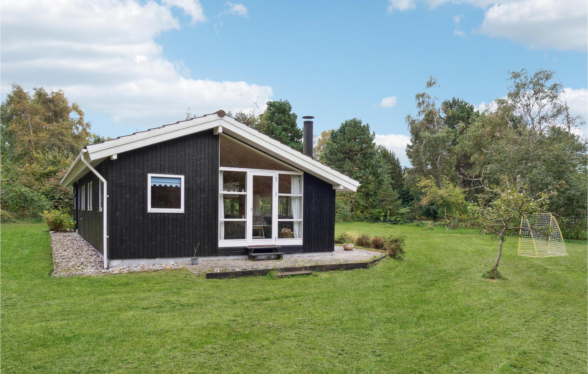 Hyggeligt træhus tæt på stranden i Nykøbing Sj med brændeovn og udendørs aktiviteter.