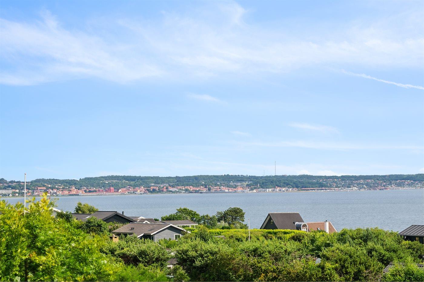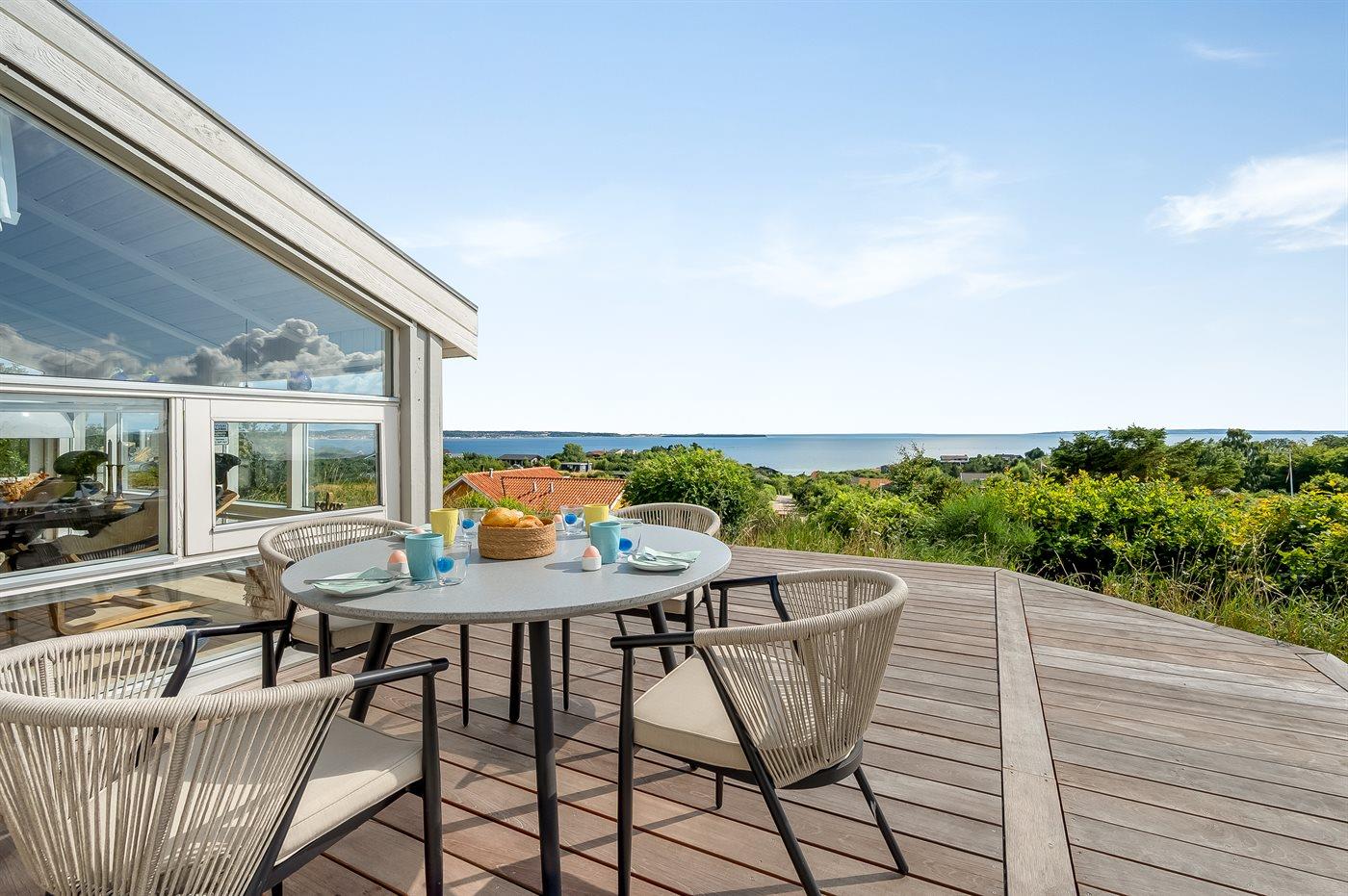 Dette fantastiske sommerhus er helt unikt placeret på bakketoppen over Ebeltoft. Her har du nok en af byens bedste udsigter over Ebeltoft Vig og National Park Mols Bjerge.
