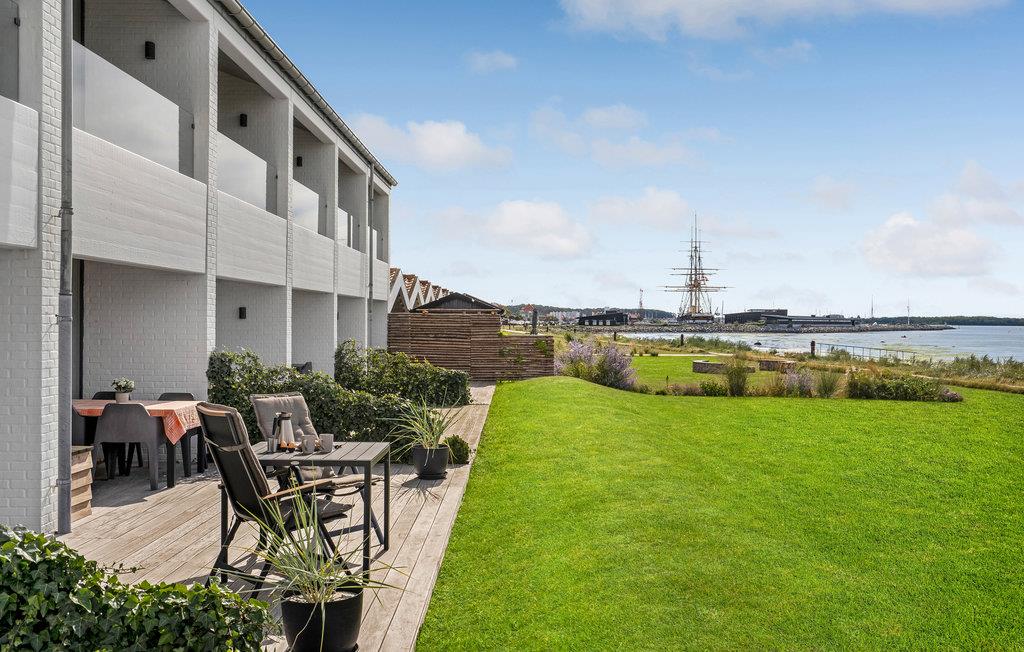 I bor i første række ud til Ebeltoft-bugten og har udsigt til Fregatten Jylland. Skuldrene sænker sig automatisk i de fantastiske omgivelser, og feriestemningen indfinder sig med det samme.