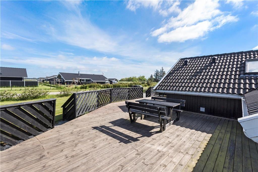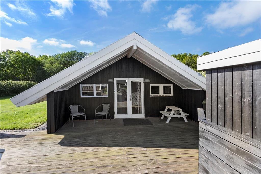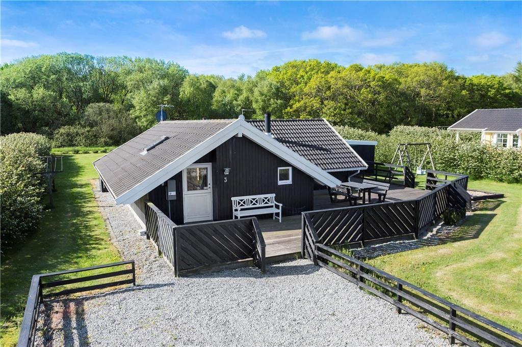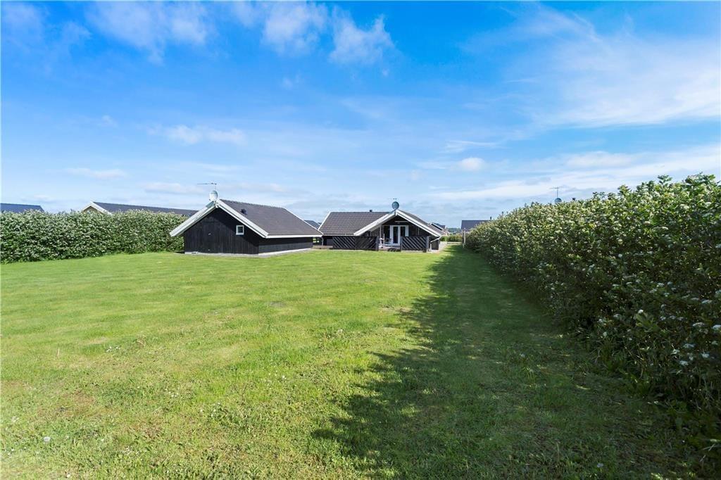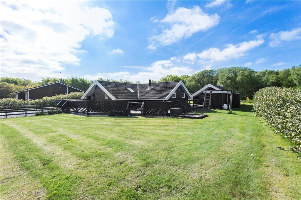 Også udenfor byder sommerhuset på alt, hvad der skal til for at opfylde hele familiens behov. Terrasserne hører til de større og løber på både nord-, øst- og vestsiden, og rundt om sommerhuset er der masser af kroge, hvor man kan hygge sig og nyde solen. Børnene kan muntre sig og brænde energi af på den store plæne, mens de yngste kan lege trygt i sandkassen.