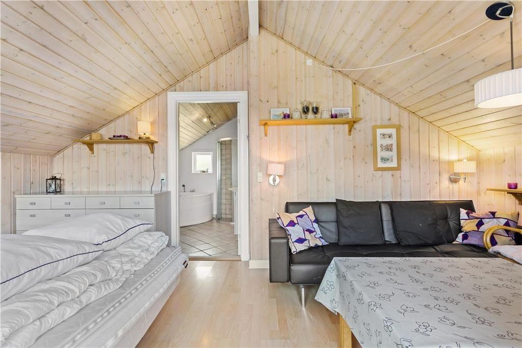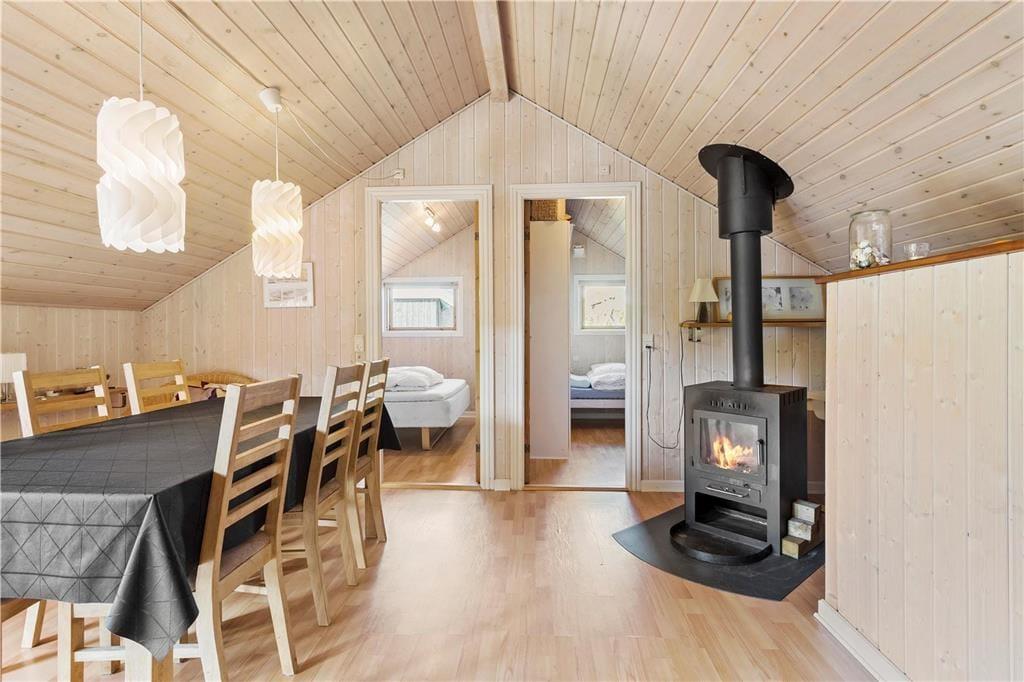 Dette sommerhus er den perfekte base, for en familie som gerne vil holde ferie tæt ved vandet og have nem adgang til gode udflugtsmål. Sommerhuset byder på en praktisk indretning, bla. med et stort og lyst anneks, hvor et par eller familiens teenagere kan bo lidt for sig selv. Annekset har sit eget store badeværelse med bruser og spabad samt en lille stue. Ønsker man ikke at bruge annekset, så har hoved huset alt, hvad man skal bruge, og her er god plads til en stor familie. Hyggen spreder sig, når man tænder op i brændeovnen, og skulle vejret vise sig fra sin kedelige side, kan man samles i stuen til en god film på tv’et. På badeværelset finder man både vaskemaskine og tørretumbler, så man hele tiden kan have rent badetøj og tørre håndklæder til de mange badeture i fjorden eller ved stranden. Et sommerhus, som tilbyder de bedste rammer for en vellykket ferie i det nordjyske!