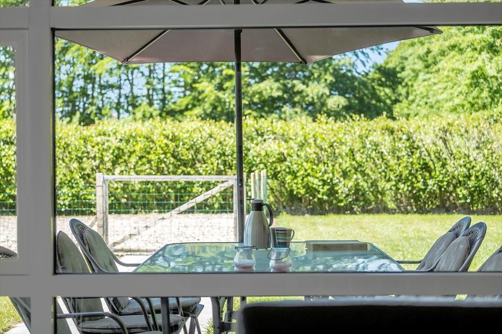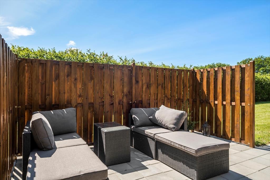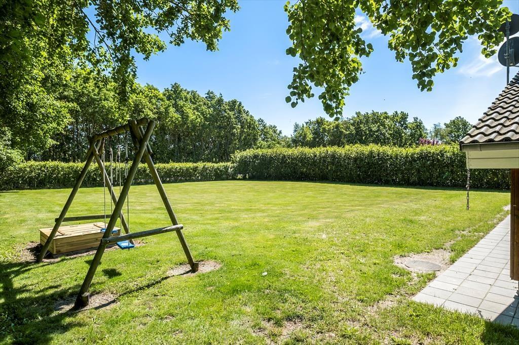 Den store og flotte grund indbyder til mange sjove timer udendørs. Ungerne kan muntre sig på den store plæne, og har man hund med på ferien, kan den trygt løbe rundt i haven, da hele grunden er indhegnet. Fra stuen kan man gå ud på en dejlig overdækket terrasse, og vil man gerne varmes igennem af solen, rykker man bare ud på den store og åbne del.