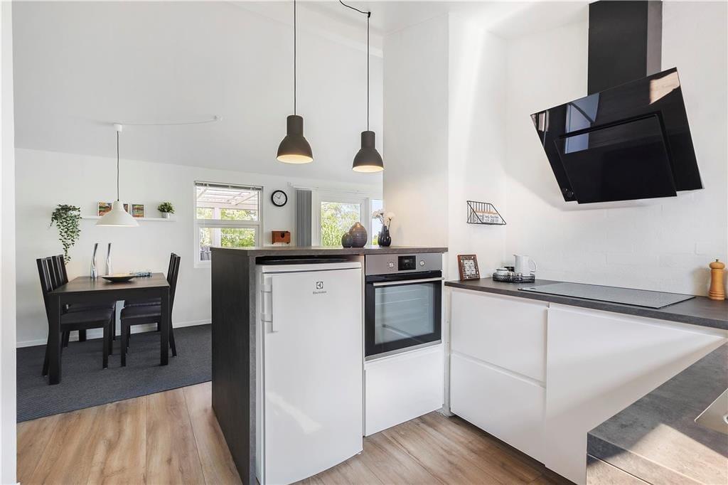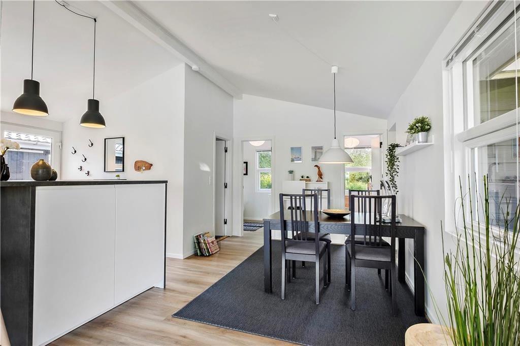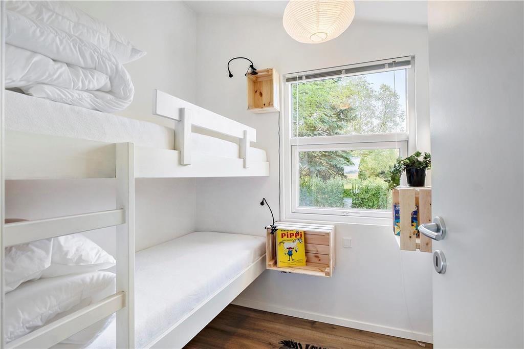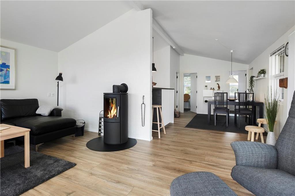 Udsigten imponerer – og det gør selve huset også. Det er nemlig totalrenoveret i 2018 og byder blandt andet på et lækkert åbent køkken-alrum og et flot badeværelse med glasbruseniche. Alle rum fremstår lyse og indbydende, også de tre soveværelser, der i alt kan rumme seks personer, dog skal det nævnes at køjesengene måler 193 cm i længden. Det allerbedste opholdssted er nu nok alligevel stuen, for her sørger de store vinduespartier for, at I helt uhindret kan suge panoramavuet over Limfjorden til jer. Hvis det er køligt udenfor, kan I tænde for varmepumpen eller sætte gang i brændeovnen, mens I læner jer godt tilbage i sofaen nær vinduet.