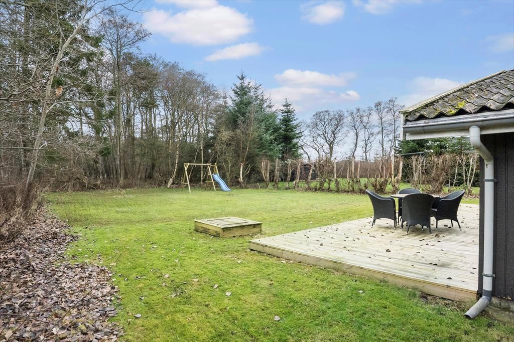 Haven omkring sommerhuset er som skabt til familiehygge. Den store plæne indbyder til leg og boldspil, og for de mindste gæster er der gynge, rutsjebane og sandkasse – et sandt paradis for børn. Terrassen er det oplagte sted at nyde dagens måltider, måske med grillen tændt og en kølig forfriskning ved hånden. Her kan du finde ro i de komfortable havemøbler, mens du nyder fuglekvidder og den friske havluft. De ugenerede omgivelser skaber rammerne for total afslapning, uanset om du foretrækker at dase i solen eller finde et køligt skyggefuldt hjørne med en god kop kaffe.