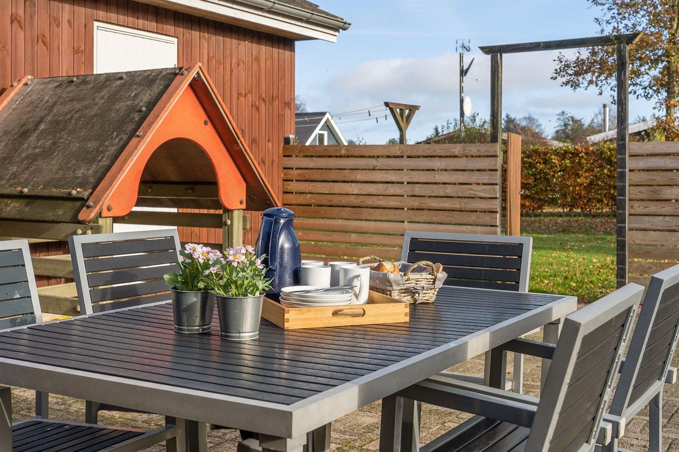 Ferieboligen er beliggende på en 1200 m² stor naturgrund. Der er 1000 m til havet. Der er 300 m til fjorden. Nærmeste forretning er beliggende i en afstand af 500 m. Til ferieboligen hører 90 m² terrasseareal. Der er redskabsrum. Gynge. Sandkasse. Legehus. Trampolin. Der er mulighed for at tilberede maden udendørs i udekøkkenet.
