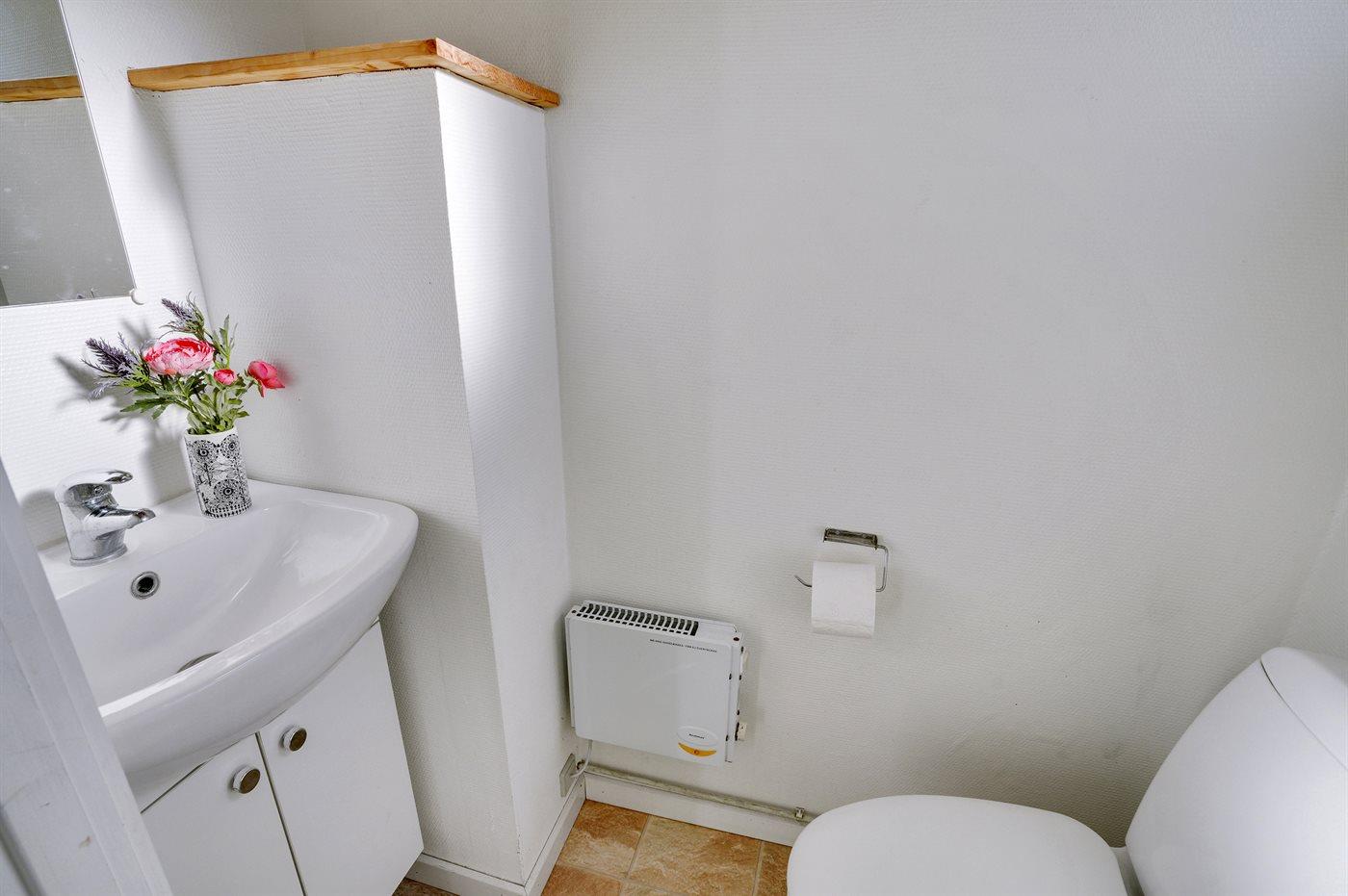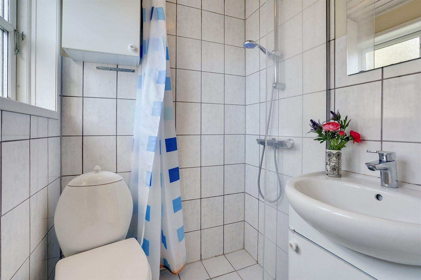 Der er 1 badeværelse med bruser og 2 toiletter, heraf 1 gæstetoilet. Der er gulvvarme på 1 badeværelse.